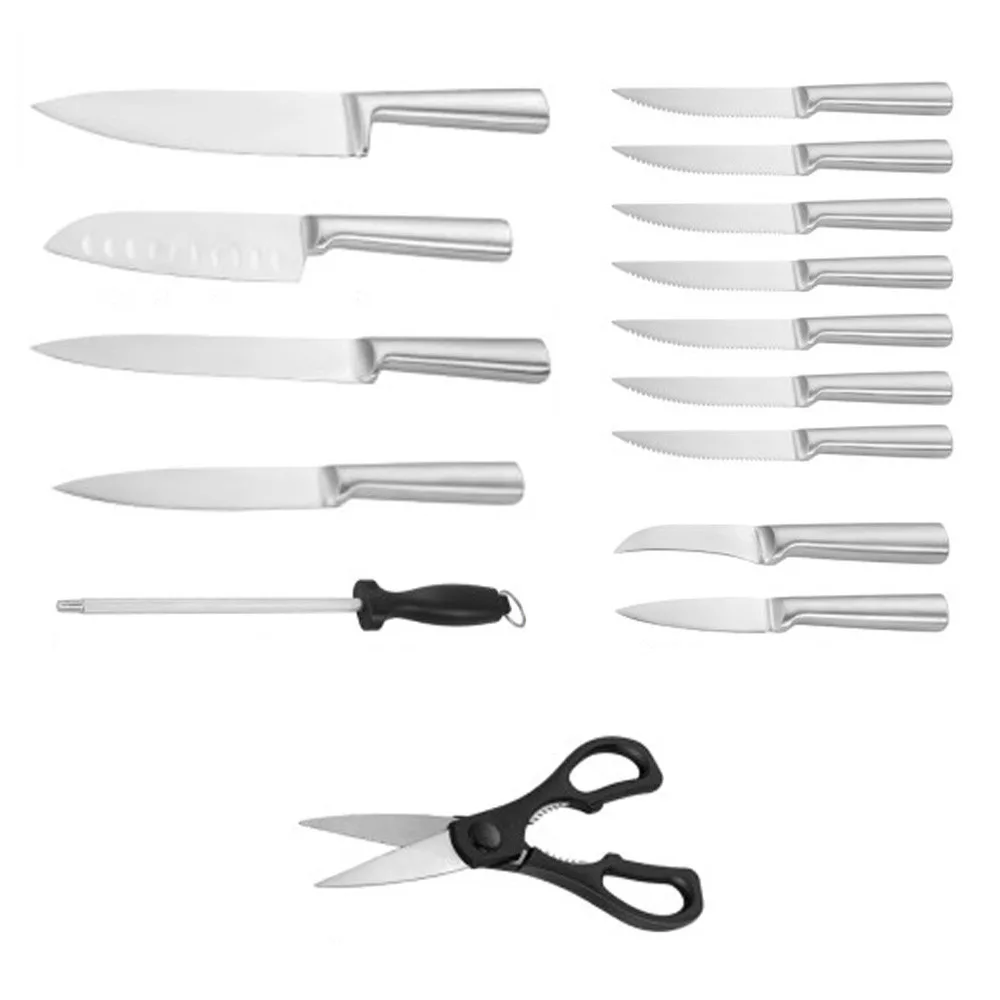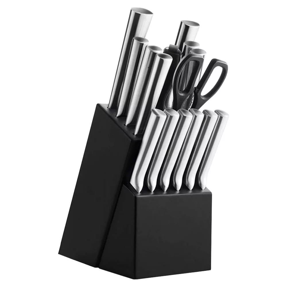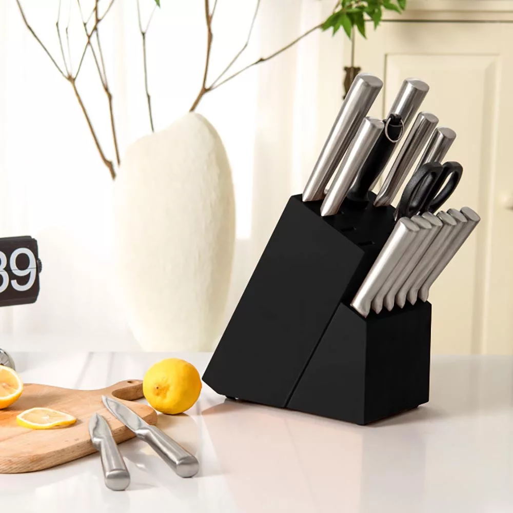 A készlet tartalmaz 6 steak kést, séfkést, japán kést, ollót és hámozókat – mindent, amire a konyhában szükséged lehet. Rendszerezett és könnyen hozzáférhető tárolás a fa állványnak köszönhetően.