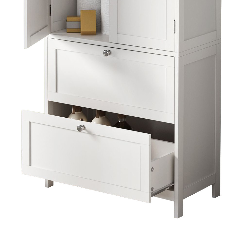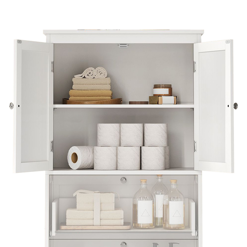 A fehér szín, díszített ajtópanelek és letisztult forma eleganciát visz a térbe, miközben egyszerűen illeszkedik bármely fürdőszobai enteriőrhöz.