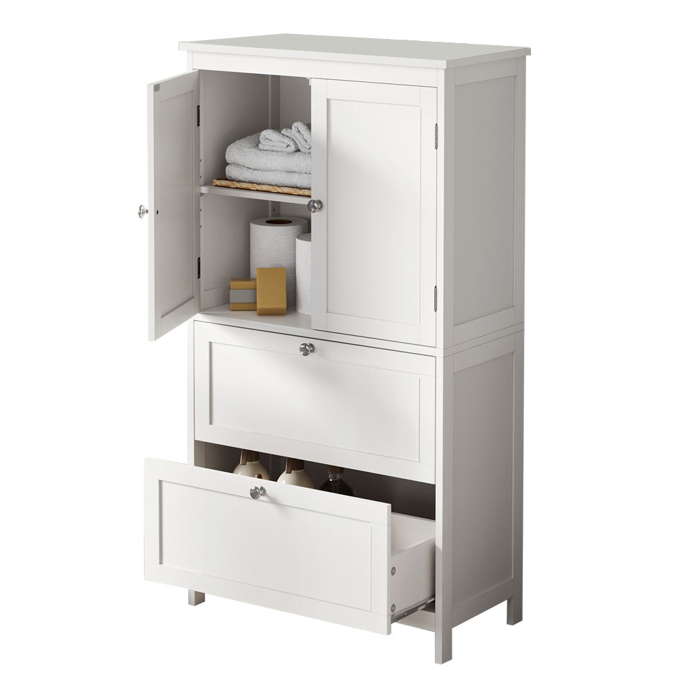 A két fiókban a napi használatú eszközök, az ajtók mögött pedig állítható polcon rendszerezheted a törölközőket, tartalék WC-papírt és egyéb holmikat.