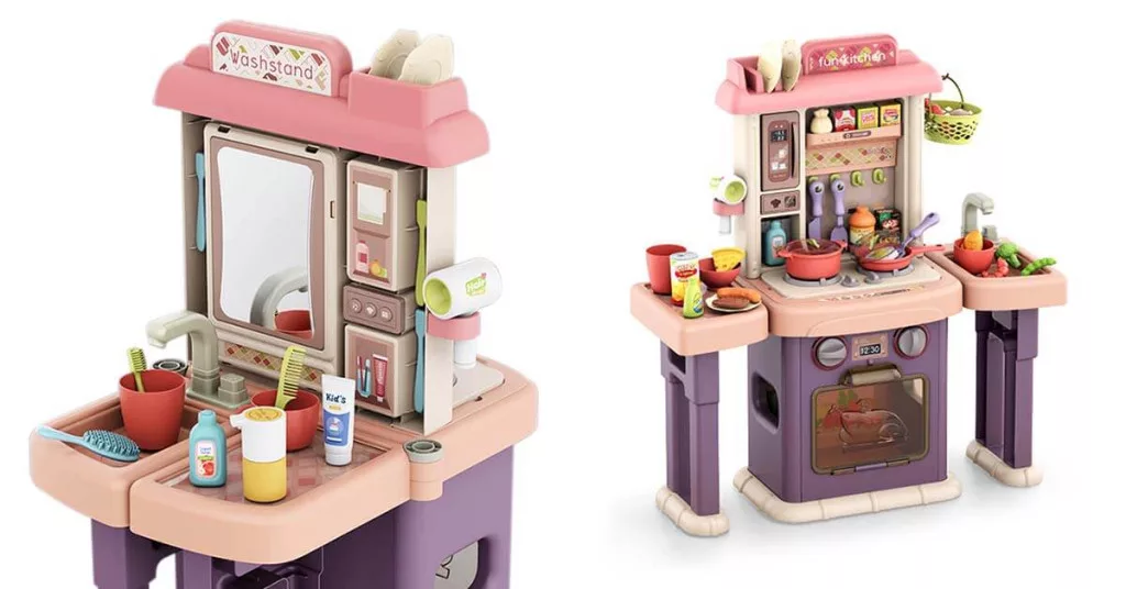 A játékkonyha és fürdőszoba egyedi megoldásként egyesíti a két legnépszerűbb szerepjátékot. Az egyik oldal konyhaként szolgál, ahol a gyerekek elkészíthetik "ételeiket", míg a másik oldal a fürdőszobai kiegészítők világába vezeti őket. Ez a kombináció lehetővé teszi, hogy egyszerre fejlődjenek a kreativitás, a kézügyesség és a napi rutinok ismeretei.