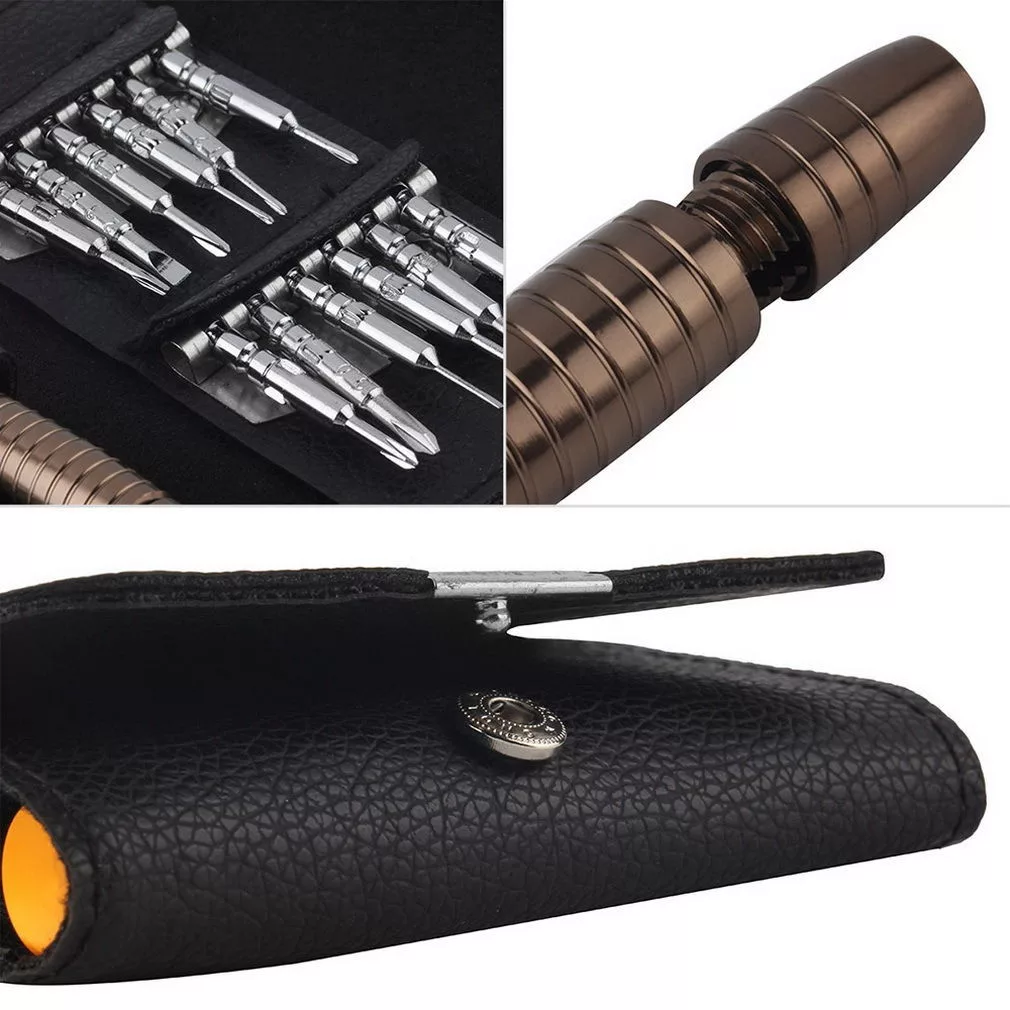 A csavarhúzó nyele ergonomikus, csúszásmentes kialakítású, így hosszabb használat során is kényelmes fogást biztosít. A tok puha bőrhatású anyagból készült, amely nemcsak elegáns megjelenést nyújt, hanem megvédi a szerszámokat a sérülésektől. Kis méretének köszönhetően bármelyik fiókban, táskában vagy szerszámosládában könnyedén elfér.