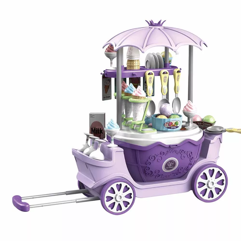 A 4 az 1-ben fagyiskocsi praktikus és hordozható megoldás. Könnyen összecsukható, így bőröndként szállítható, a kerekeken guruló kialakítás pedig egyszerű mozgathatóságot biztosít a gyerekek számára. A kocsiról levehető kosár külön is használható, amelyben minden szükséges játékeszköz elfér.