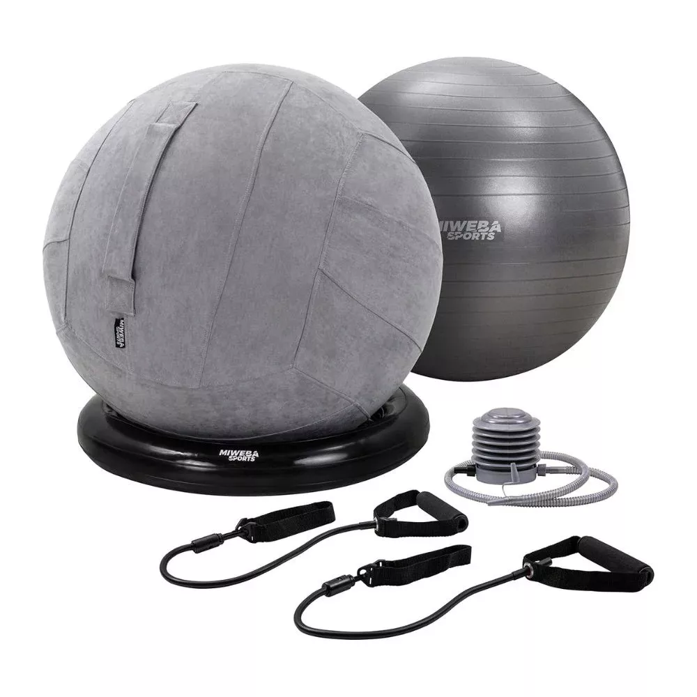 A készlet minden szükséges kiegészítőt tartalmaz a praktikus használathoz. A labdaalátét megakadályozza az elgurulást ülés közben, a kézi pumpával gyorsan felfújható a labda, az expander szalagok pedig további edzéslehetőségeket biztosítanak.