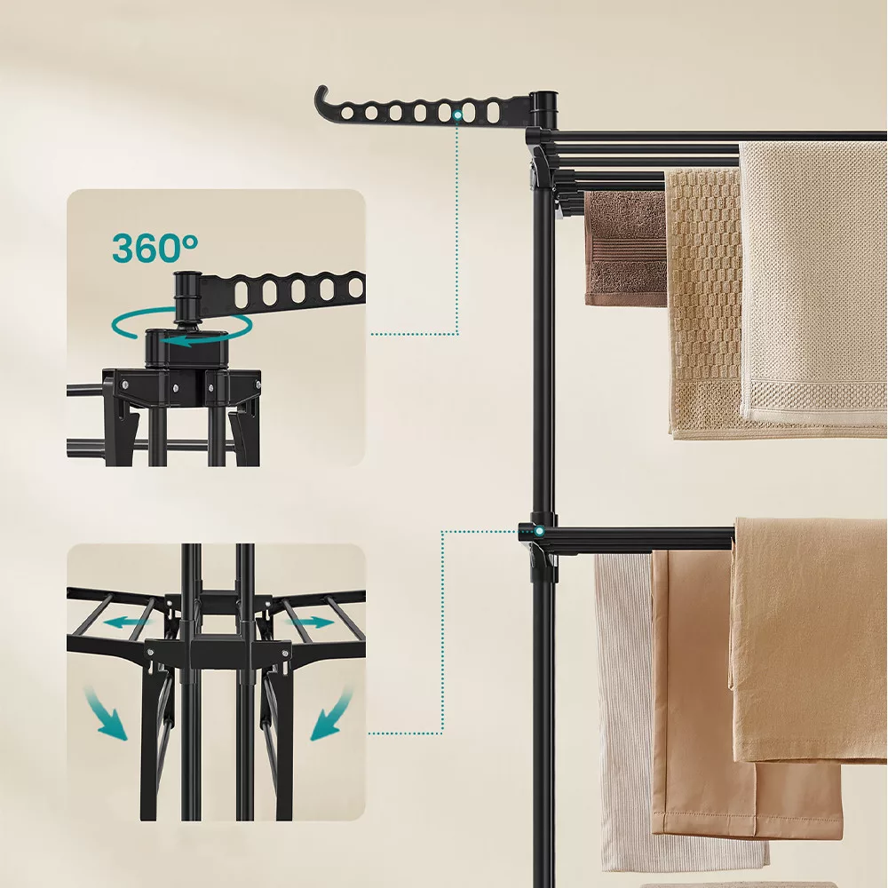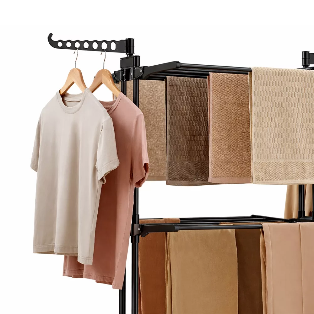 A forgatható oldalsó szárnyak extra helyet biztosítanak vállfák számára, így könnyedén száríthatod ingeket vagy hosszabb ruhadarabokat is gyűrődés nélkül.
