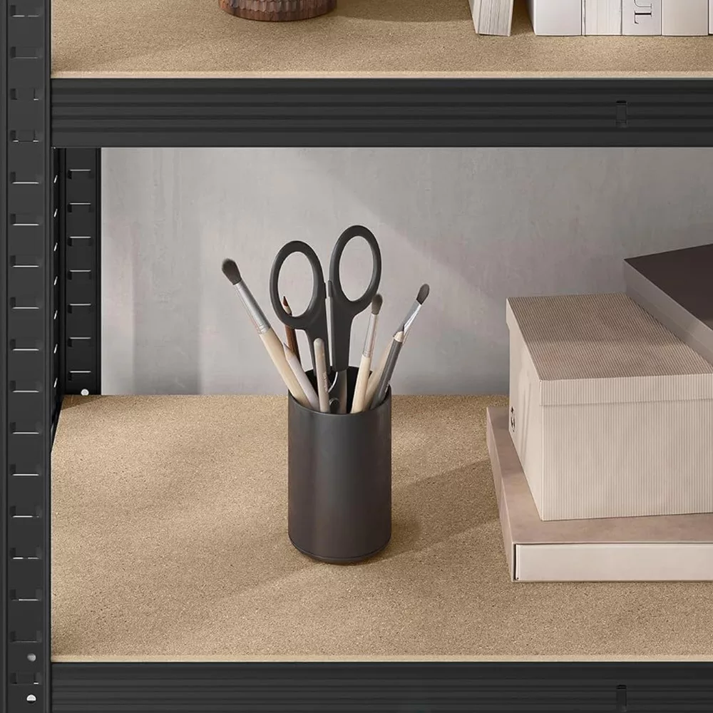 A fekete acélváz és az MDF polclapok letisztult ipari stílust képviselnek, amely bármelyik műhelyben, pincében vagy tárolóhelyiségben jól mutat. Tartós, időtálló és esztétikus megoldás a rendszerezéshez.
