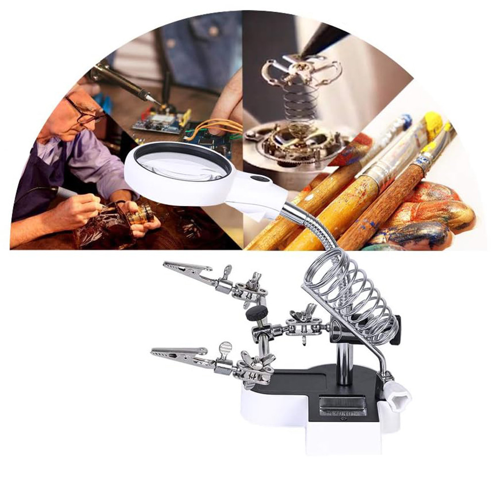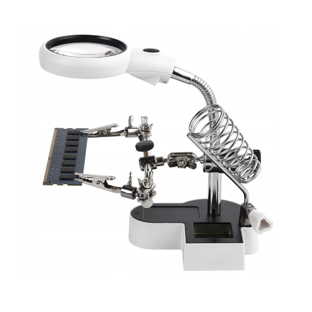 A "harmadik kéz" állítható fém csipeszei biztos fogást nyújtanak, miközben mindkét kezünk szabadon marad a munkához. A flexibilis nagyítós kar könnyedén állítható a kívánt pozícióba. A beépített spirál alakú pákatartó pedig gondoskodik az eszköz biztonságos elhelyezéséről munka közben.