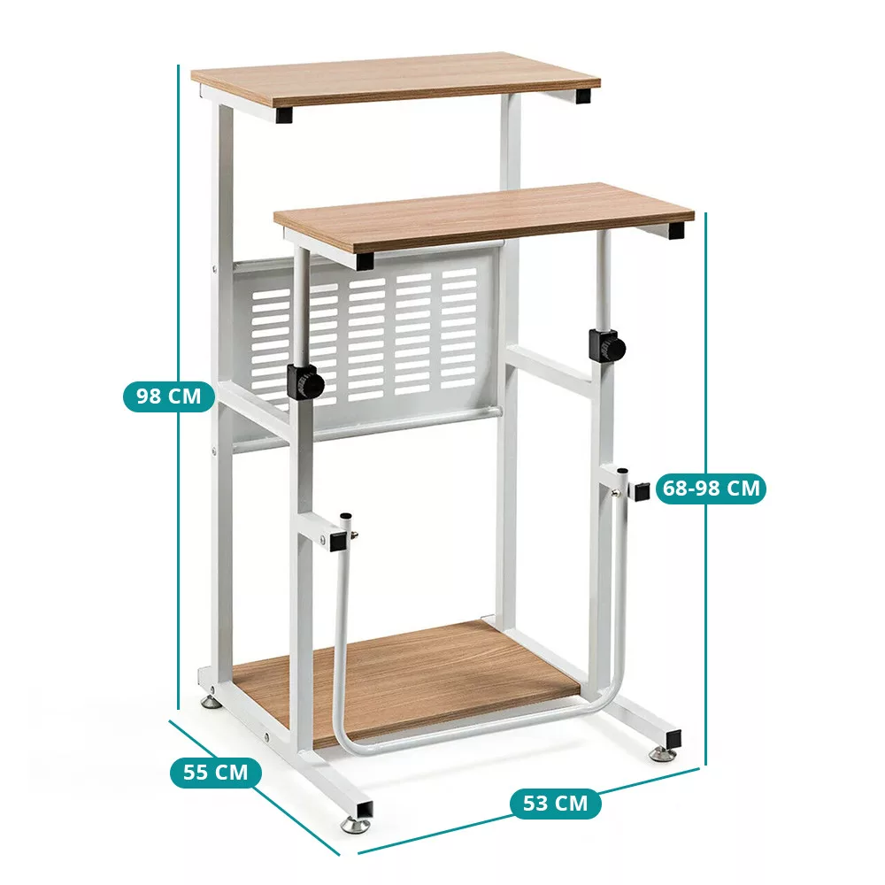 Az egyik asztallap magassága fokozatmentesen állítható 69 és 98 cm között, így ülve és állva is használható. A rögzítőgomb segítségével könnyedén a számodra legkényelmesebb pozícióba állíthatod be – legyen szó számítógépes munkáról, prezentációról vagy kreatív tevékenységről.