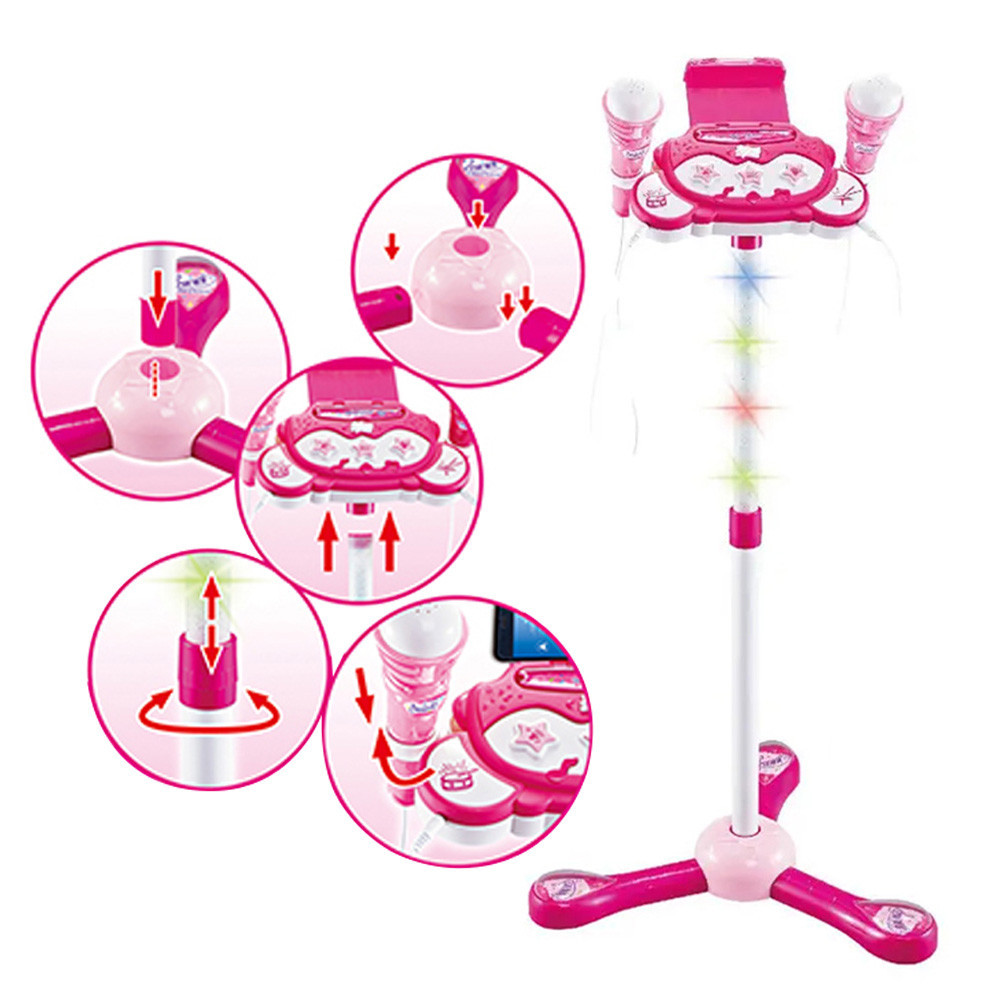 A szett 12 beépített dallamot és többféle hangeffektet kínál, például tapsot és ovációt, így a gyerekek még inkább úgy érezhetik magukat, mintha igazi koncerten lépnének fel. Az állvány magassága 70 és 100 cm között állítható, hogy minden kis énekes számára kényelmes legyen.