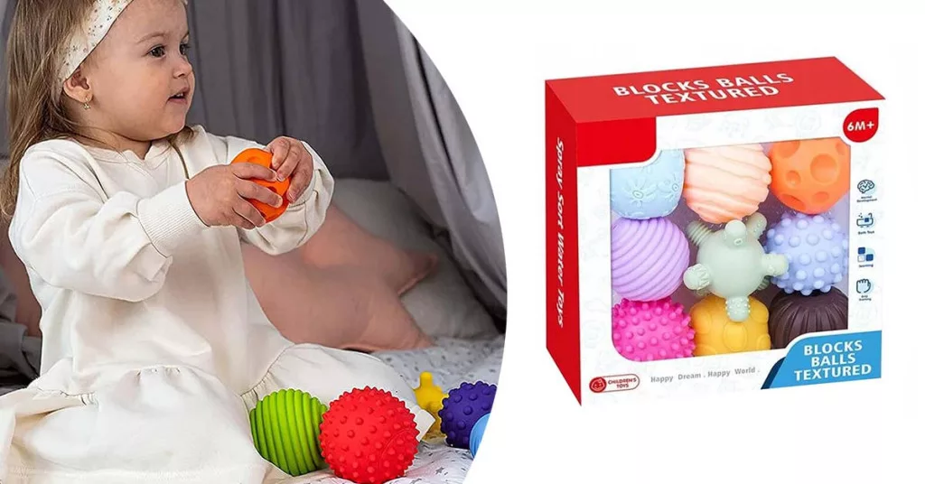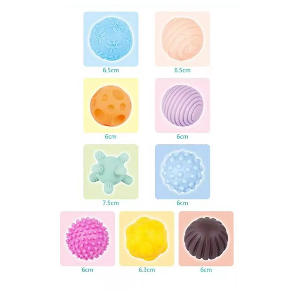 A készletben található 9 különböző textúrájú és mintázatú labda ösztönzi a baba tapintási érzékelését. A puha, barázdált, gödrös vagy éppen tüskés felületek mind új felfedeznivalót jelentenek a kis kezek számára. Ez elősegíti a finommotoros mozgások fejlődését, valamint javítja a szem-kéz koordinációt.