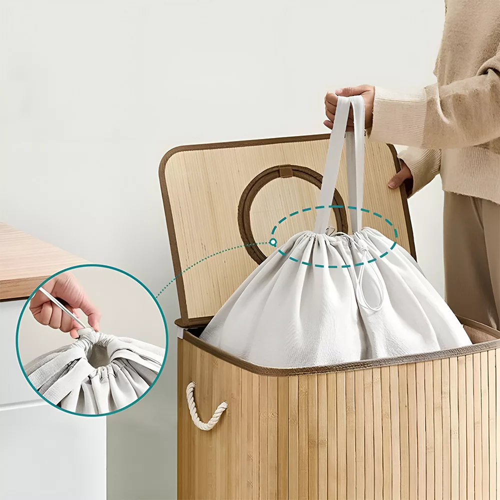 A belső zsák poliészter-pamut keverékből készült, gépben mosható és kényelmes fogantyúval ellátott, így a szennyes szállítása egyszerű. A zsák zárózsinórral is rendelkezik, hogy semmi ne essen ki útközben.