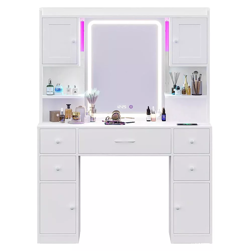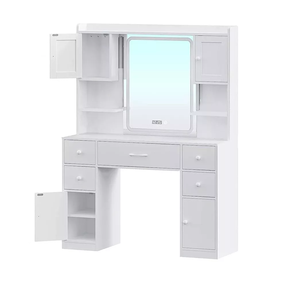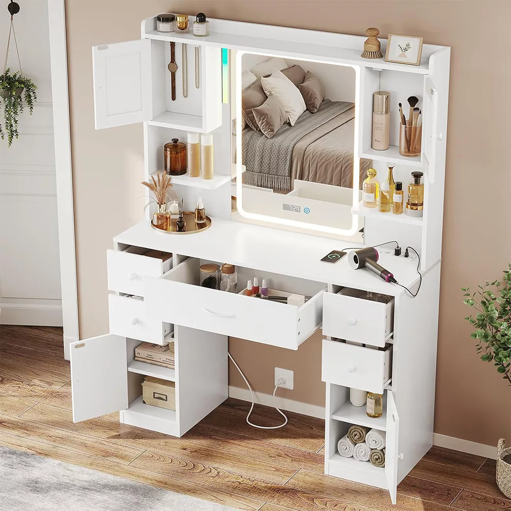 Az asztalban található polcos tárolók és fiókok extra helyet kínálnak a kisebb tárgyak rendszerezett tárolására. Legyen szó sminkecsetekről, ékszerekről vagy hajápolási eszközökről, minden elfér benne, így könnyedén fenntarthatod a rendet, miközben minden fontos tárgy elérhető közelségben marad.