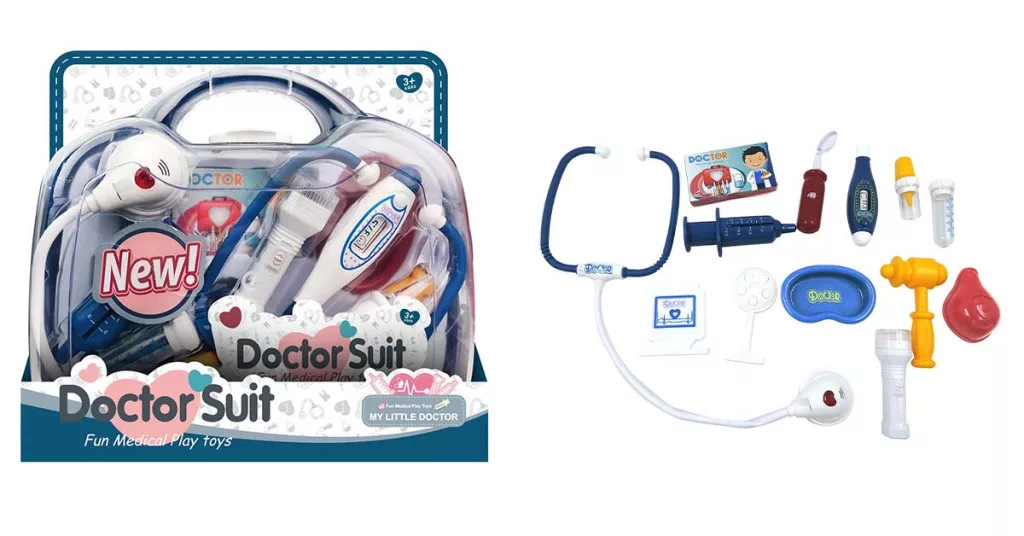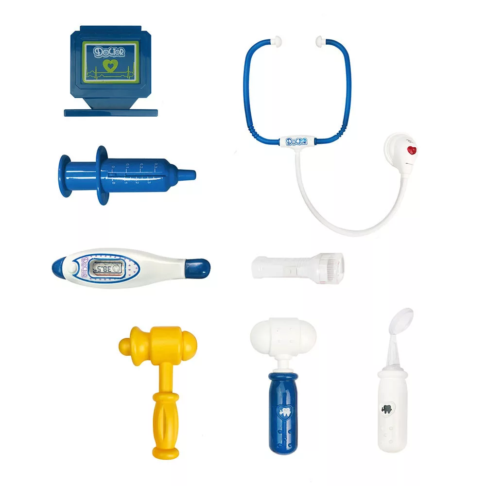 Kiegészítők: 1db játék EKG, 1db endoszkóp, 1db injekciós tű, 1db lázmérő, 1db kémcső, 1db kalapács, 1db fogó, 1db ágytál, 1db játék lámpa, 1db pipetta, 1 db elemlámpa