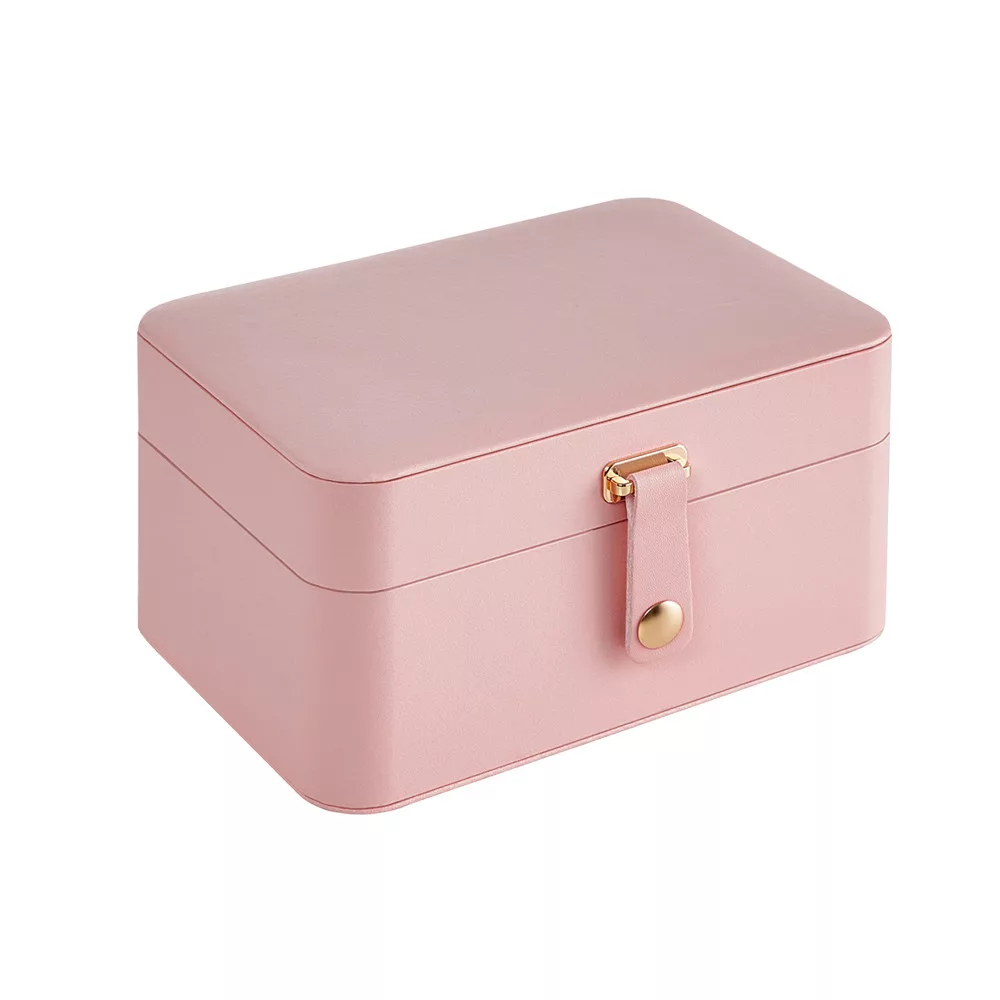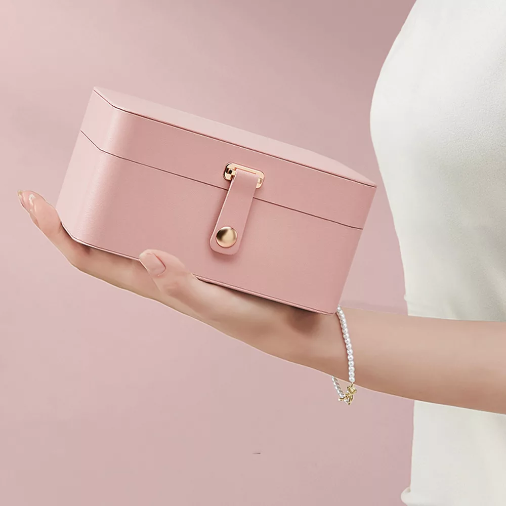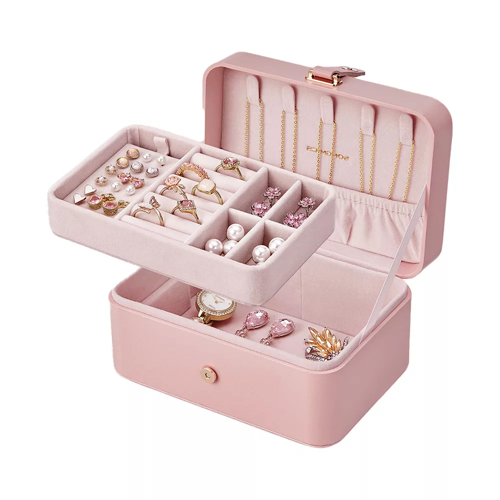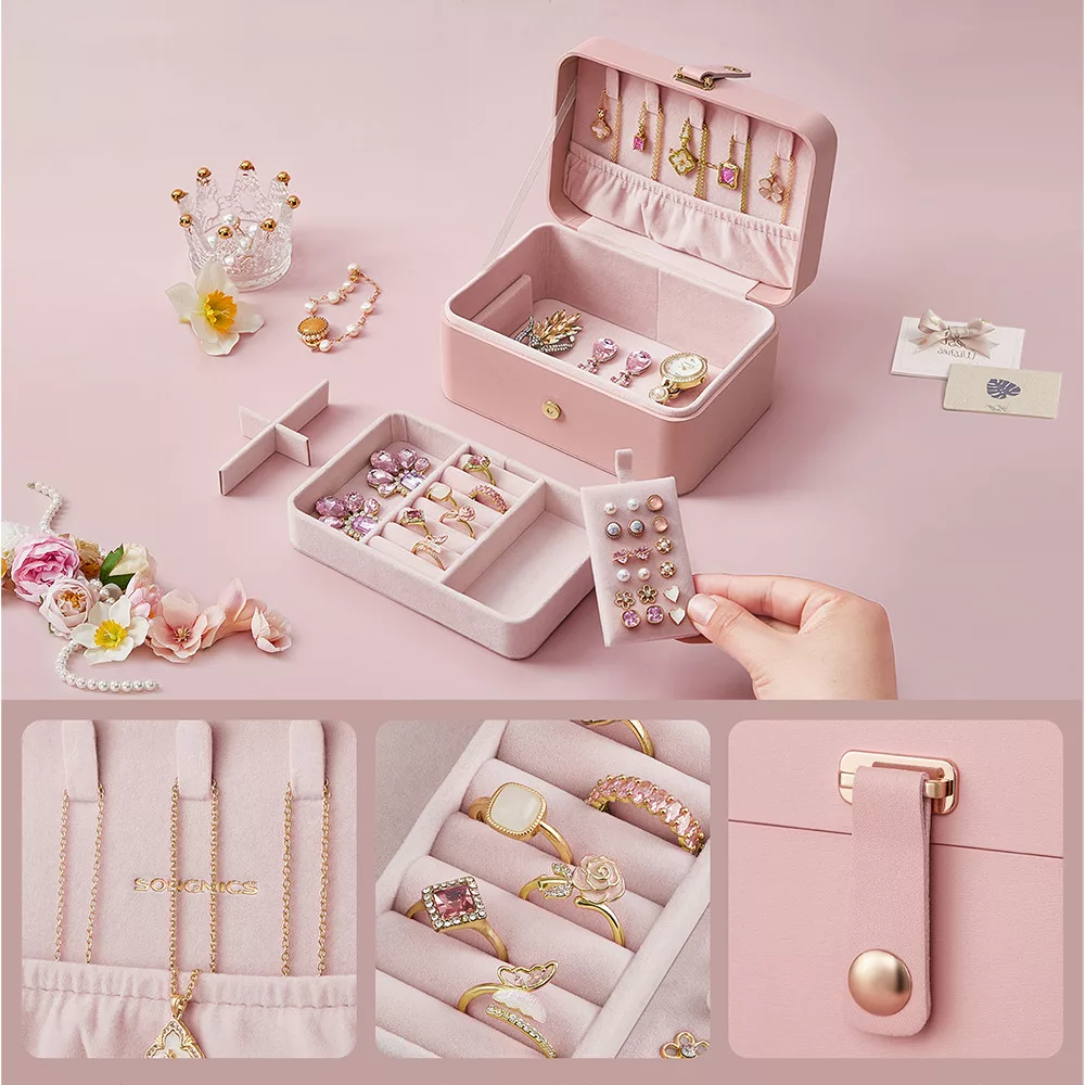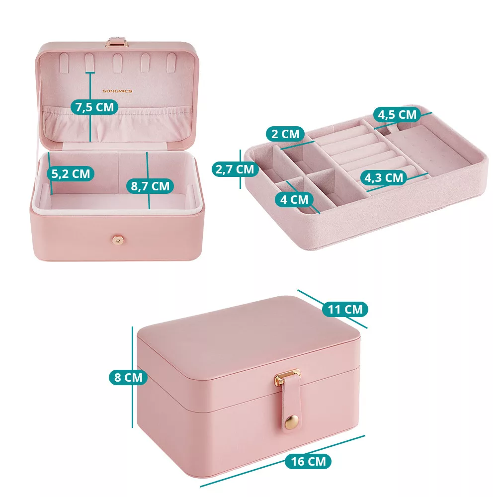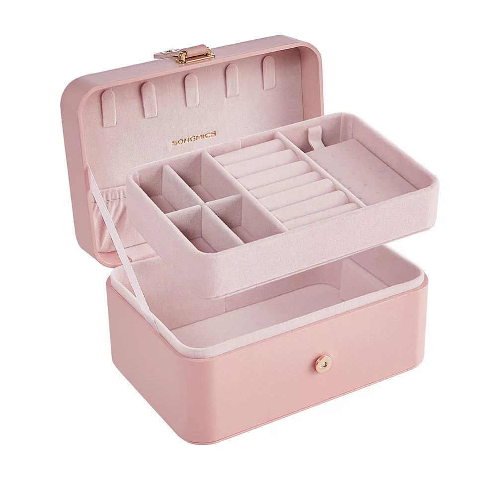 A két szintes tárolórendszer külön rekeszekkel segít rendszerezni a gyűrűket, fülbevalókat, karkötőket és nyakláncokat. Az 5 nyaklánctartó kampó megakadályozza az összegubancolódást, míg a kivehető tálca rugalmas tárolást biztosít.