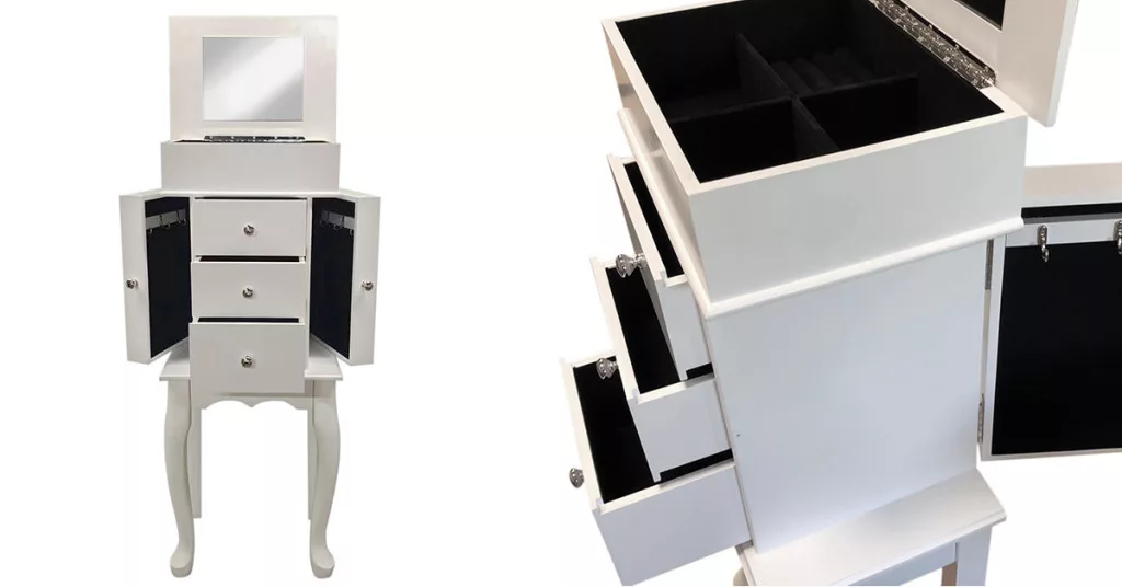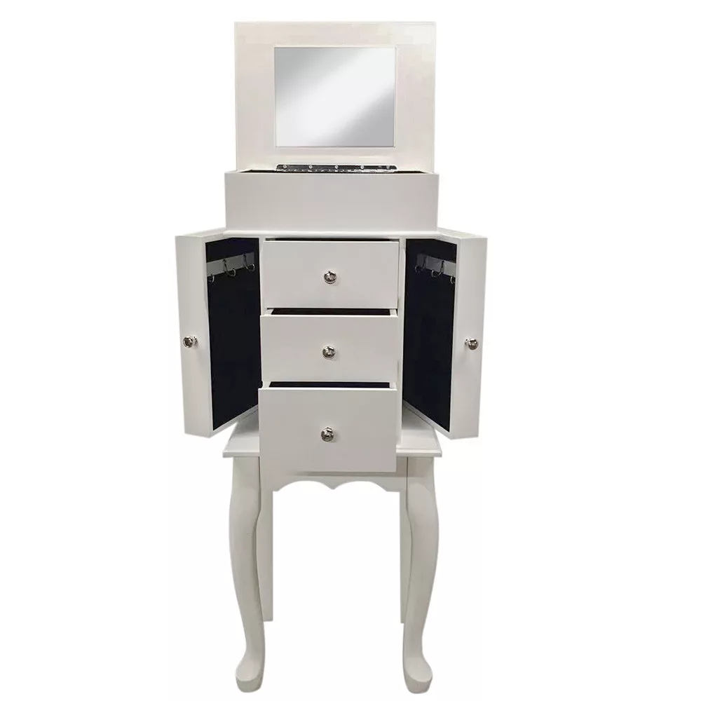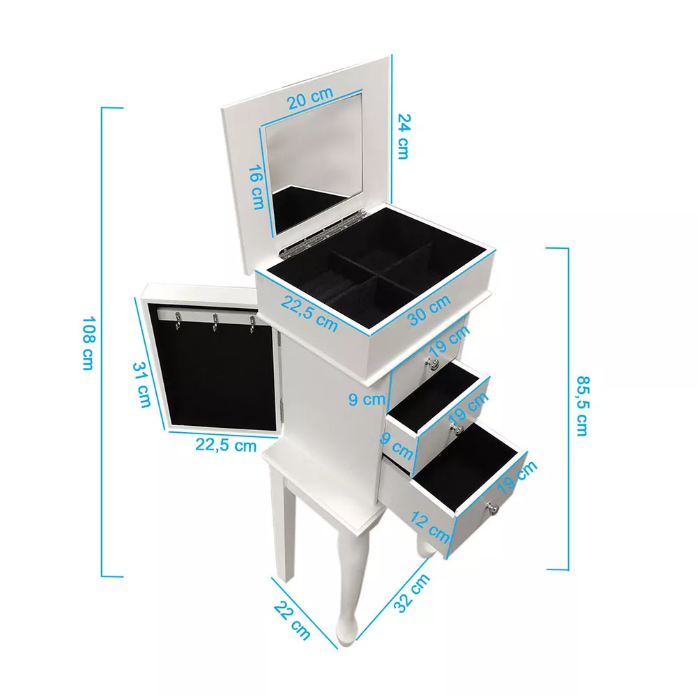 A szekrény praktikus kialakítása lehetővé teszi az ékszerek rendszerezett tárolását. A három fiók, a két oldalsó szekrény és a felső, tükörrel ellátott tárolórész külön helyet biztosít a nyakláncoknak, gyűrűknek, karkötőknek és egyéb kiegészítőknek.