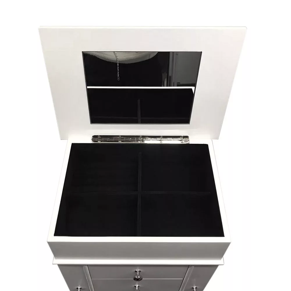 A felső tárolórész belsejében egy tükör található, amely megkönnyíti az ékszerek felpróbálását és a napi készülődést.