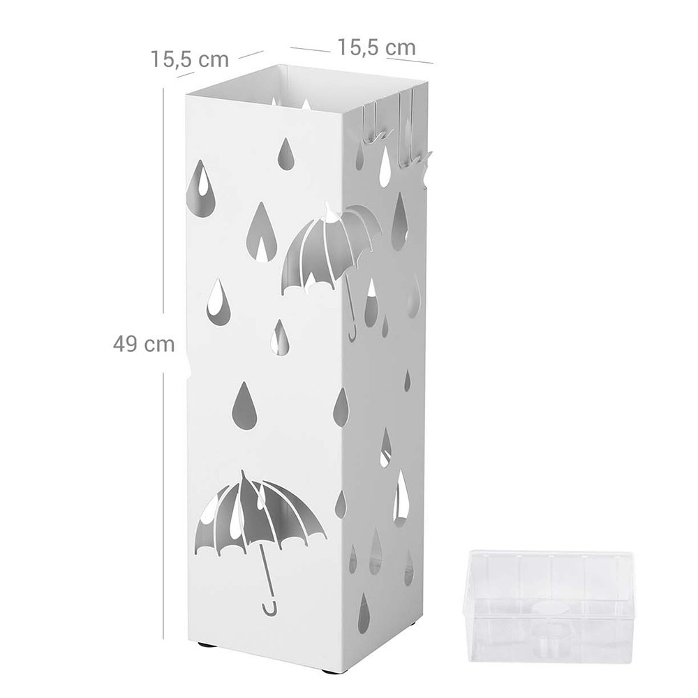 A kompakt kialakítású, 15,5 × 15,5 cm alapterületű tartó akár több hosszú esernyőnek is helyet biztosít. A csomagban található 4 akasztó (2 hosszú, 2 rövid) ideális kiegészítő az összecsukható esernyők, sétabotok vagy kisebb eszközök rendszerezésére.