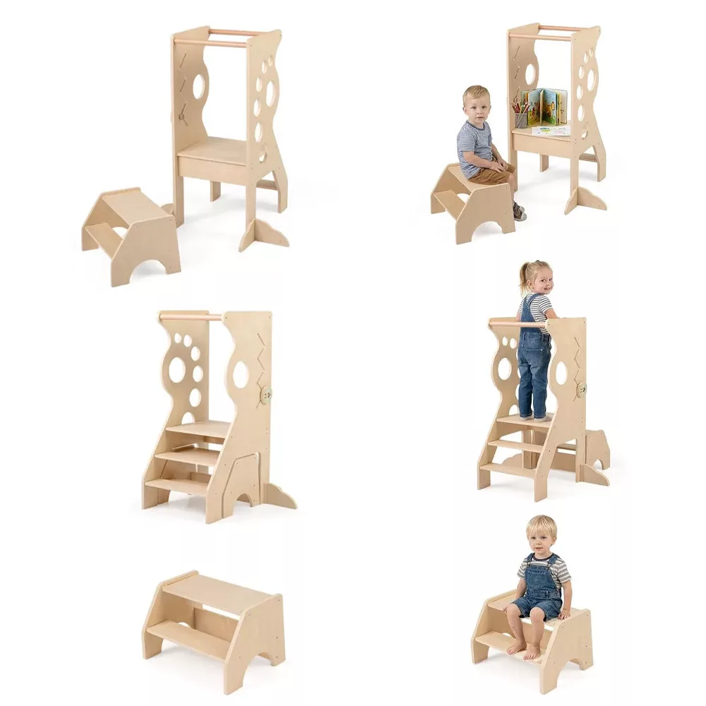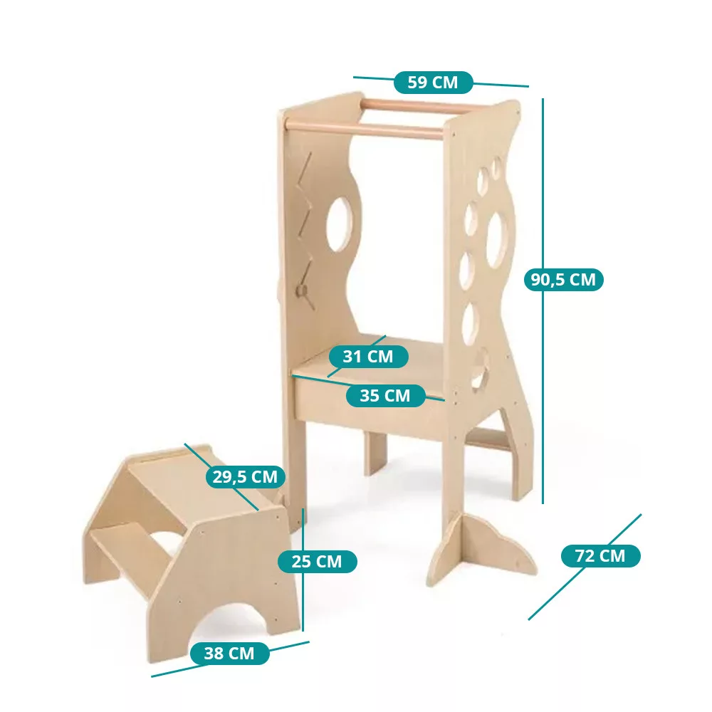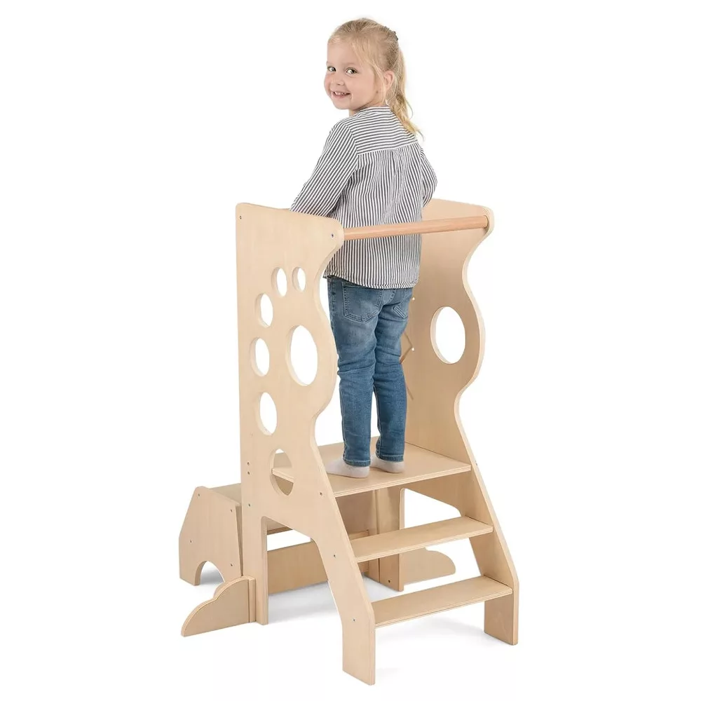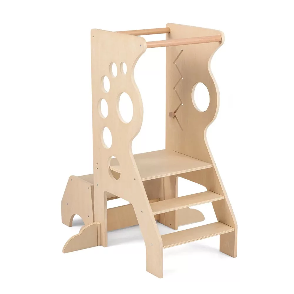 A mellékelt kétlépcsős sámli külön is használható, vagy a toronnyal együtt, amikor épp arra van szükség. Ha több hely kell, a sámli betolható, így kevesebb helyet foglal. A beépített vonalvezetős játék pedig jó elfoglaltság, amikor várni kell a következő lépésre.