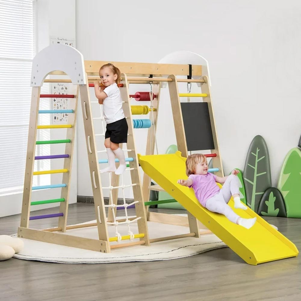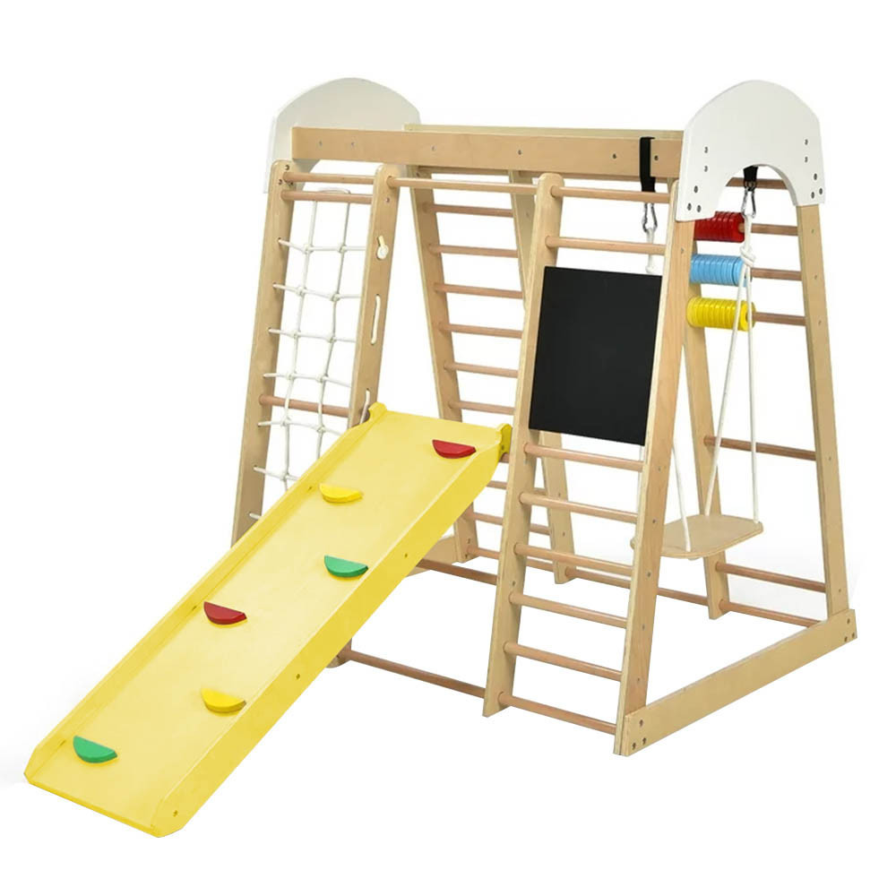A mászókán található kötélfal, mászófokok és a csúszda segítik a gyermek mozgáskoordinációjának és egyensúlyérzékének fejlődését. A csúszda egyik oldala sima, míg a másik mászókövekkel van ellátva, így kétféle módon is használható.