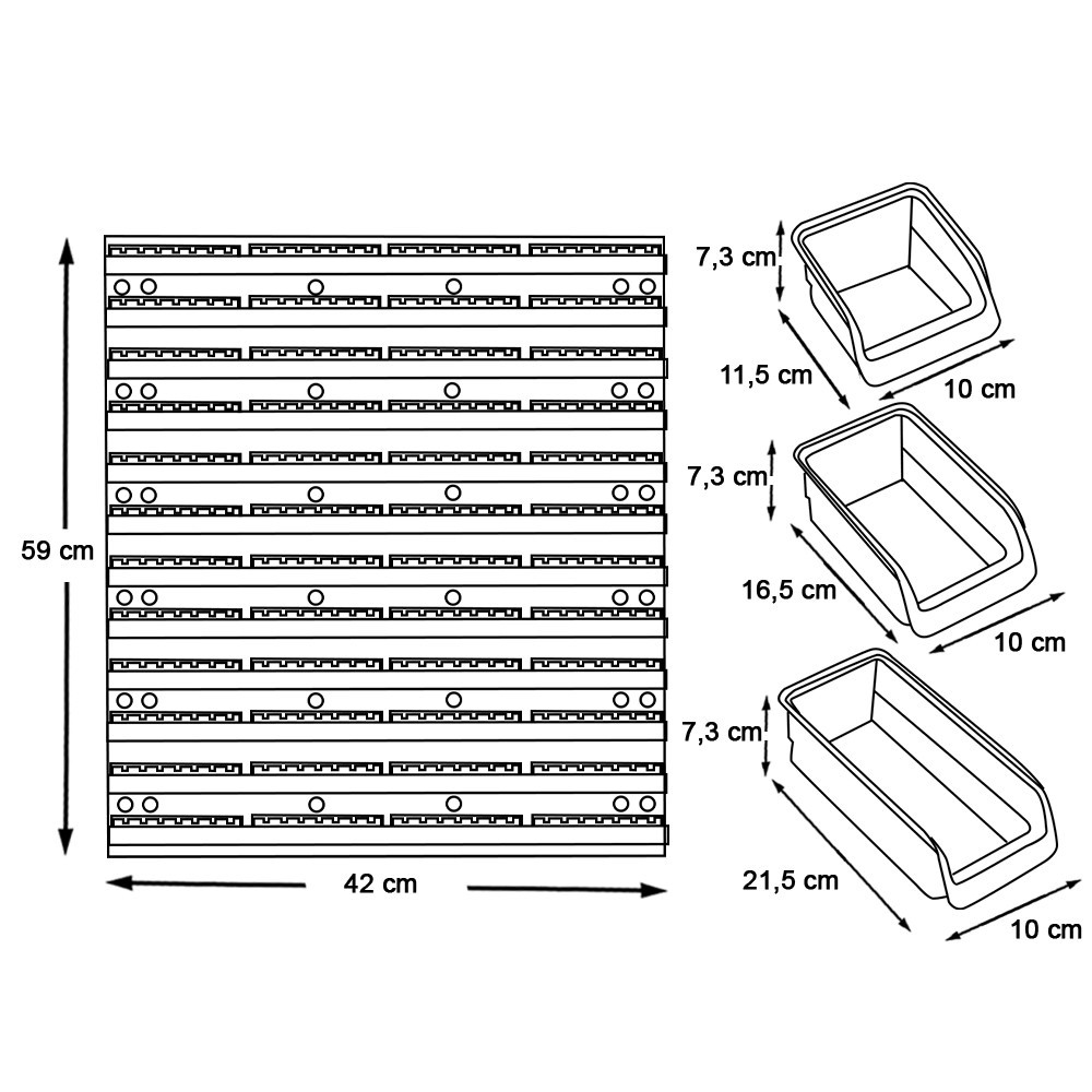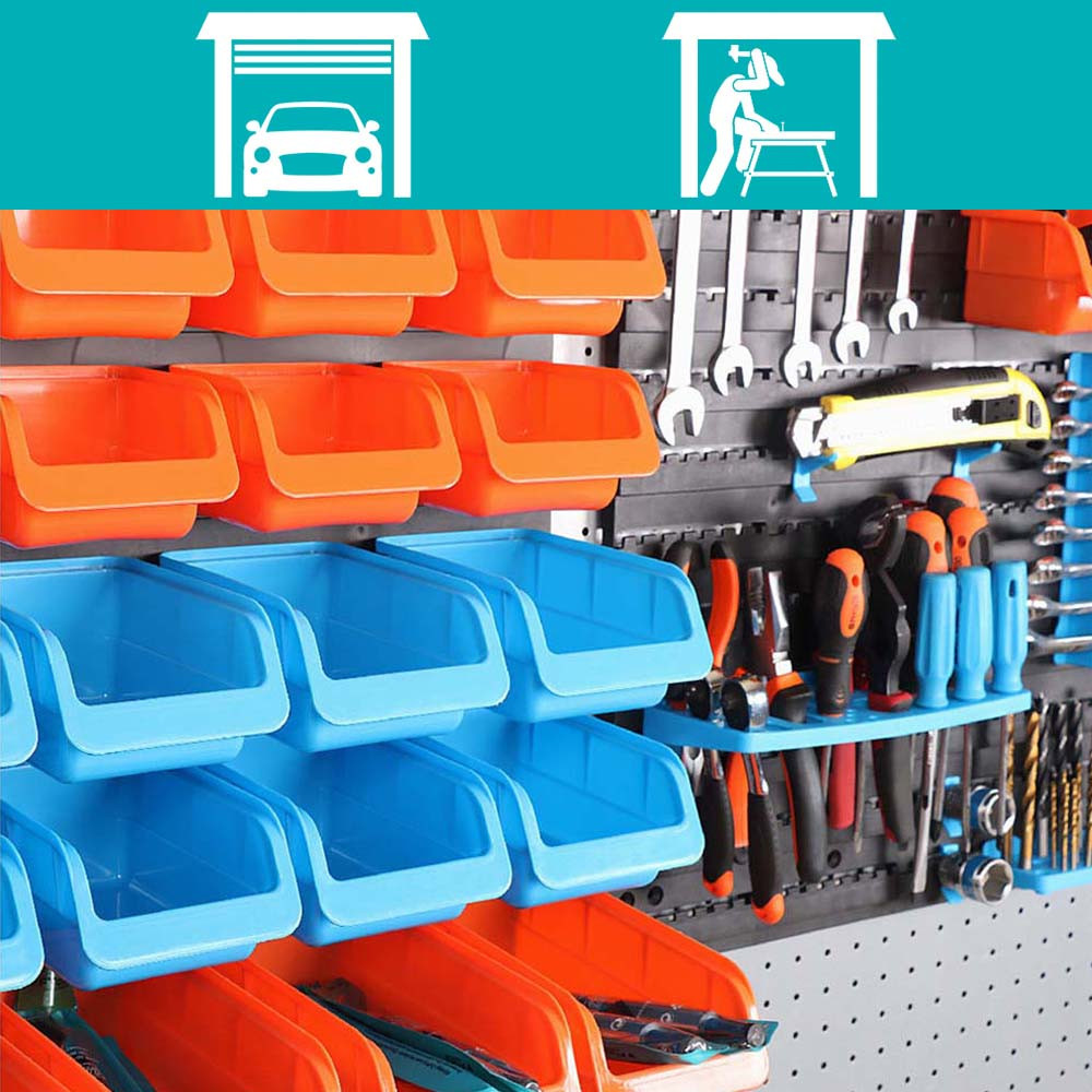 Ez a nagyobb méretű szerszámrendező rendszer két fali panelt és 43 darab tárolóelemet tartalmaz, így ideális nagyobb műhelyekbe vagy profi felhasználásra.