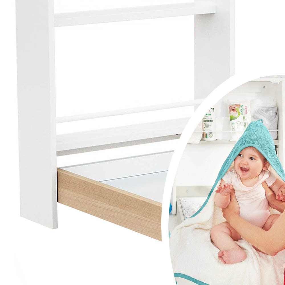 A pelenkázó a szoba bármely részére felszerelhető, így a magasságát saját igényeid szerint állíthatod be, hogy kényelmes és ergonomikus legyen a baba gondozása során. A stabil és erős szerkezet biztosítja a biztonságos használatot, akár napi többszöri pelenkázás esetén is.