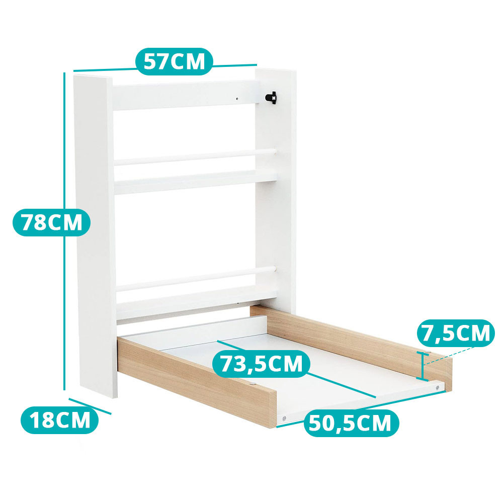 Összecsukott állapotban a pelenkázó mindössze 18 cm helyet foglal a falon, így ideális kis méretű szobákba is. A felhasznált anyagok könnyen tisztíthatók, így a higiénia fenntartása egyszerű és gyors. A 7,5 cm-es perem gondoskodik arról, hogy a pelenkázás közben minden a helyén maradjon.