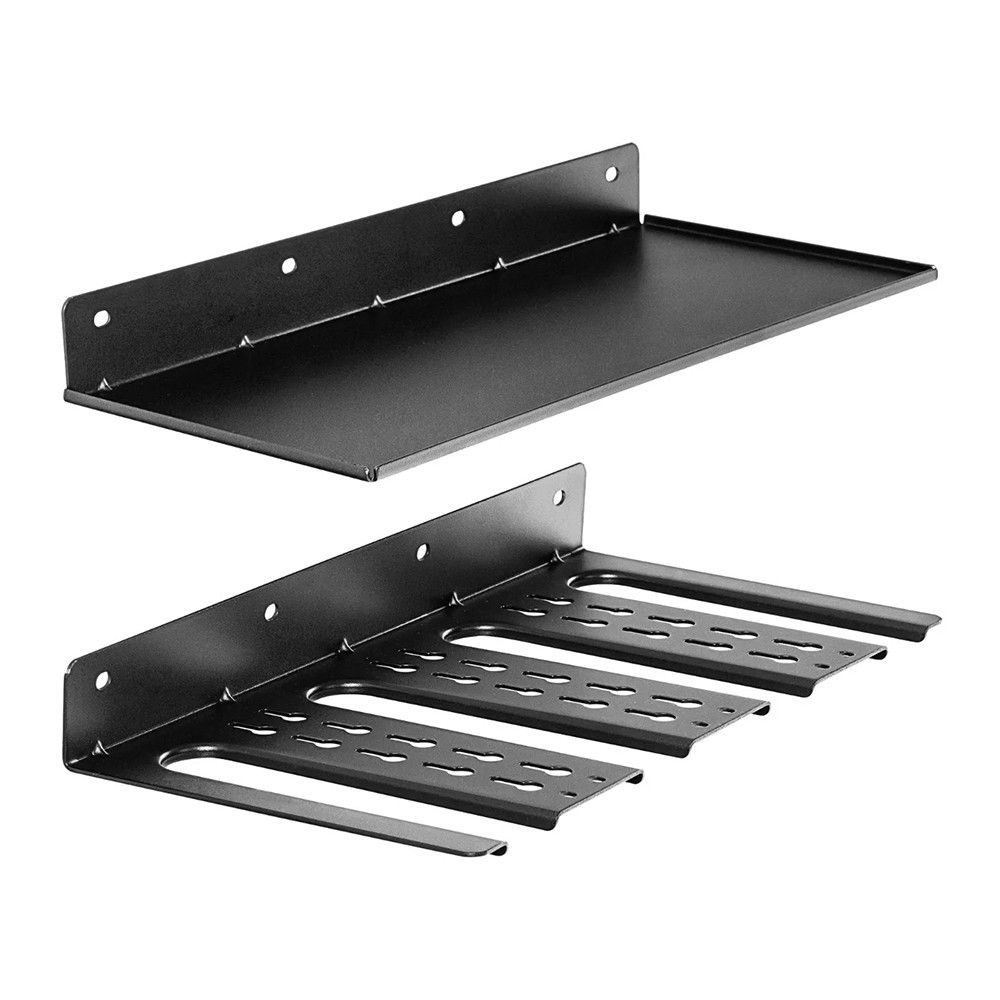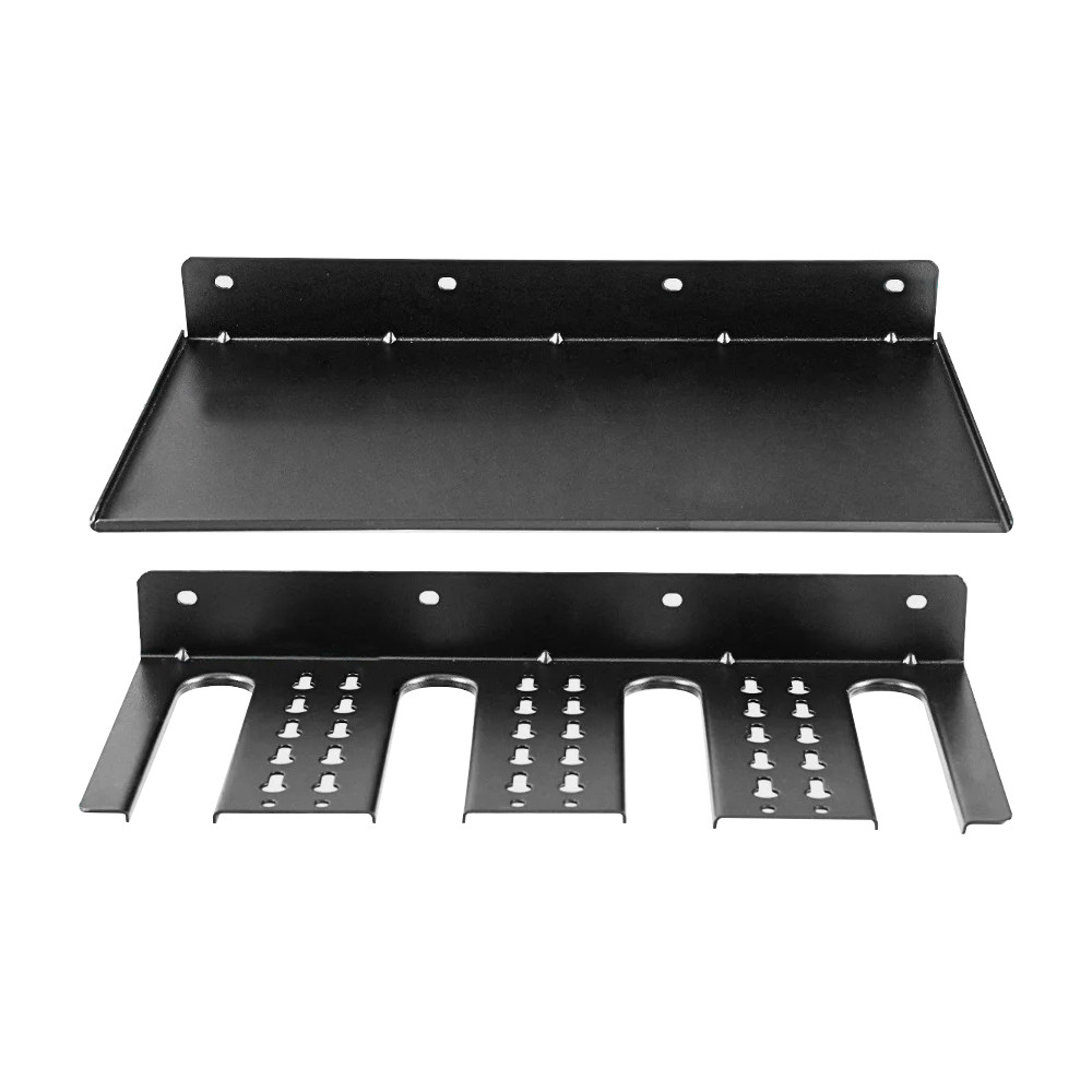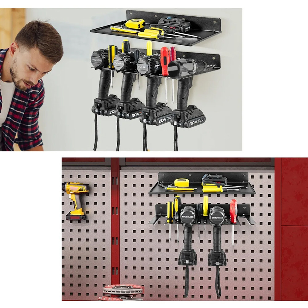 A tartó két külön részből áll, ezért a polcot és a fúrótartót olyan távolságra és olyan sorrendben rögzítheted, ahogy a falad és a szokásaid megkívánják. A rögzítőfuratok megkönnyítik a szerelést, a csomagban lévő tiplikkel pedig többféle falon is biztonságosan felteheted.
