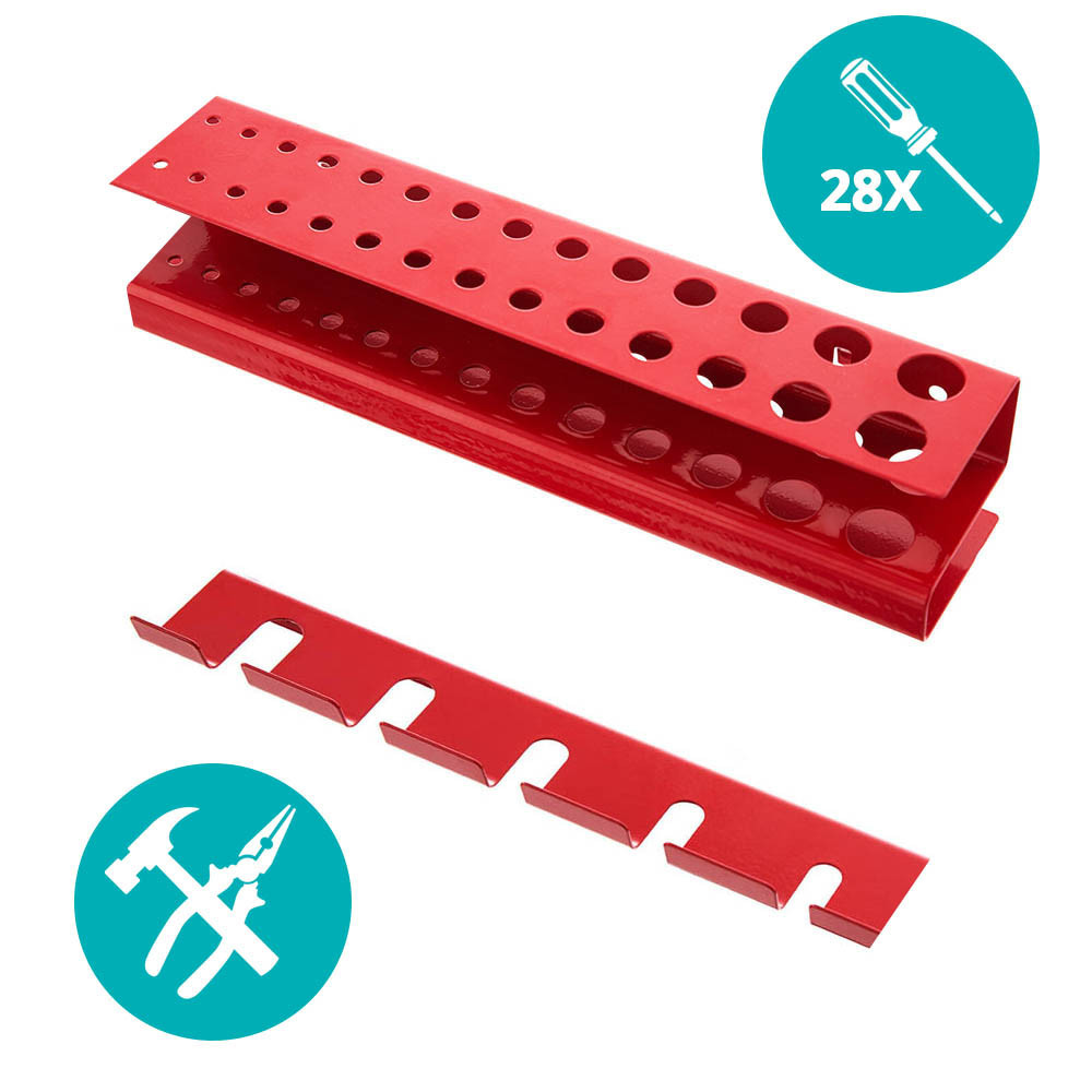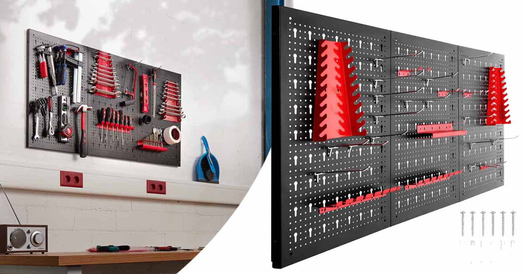 A szerszámos fal három részből áll, melyekre könnyedén, igényeidnek megfelelően felrakhatod a különböző méretű kampókat és rekeszeket, így alkalmas többek között csavarhúzók, fogók, fúrók, csavarkulcsok tárolására.