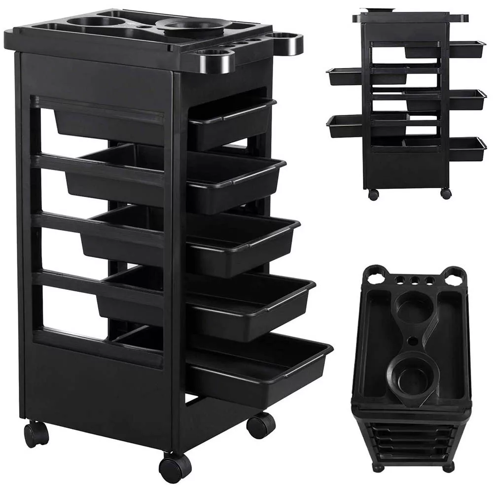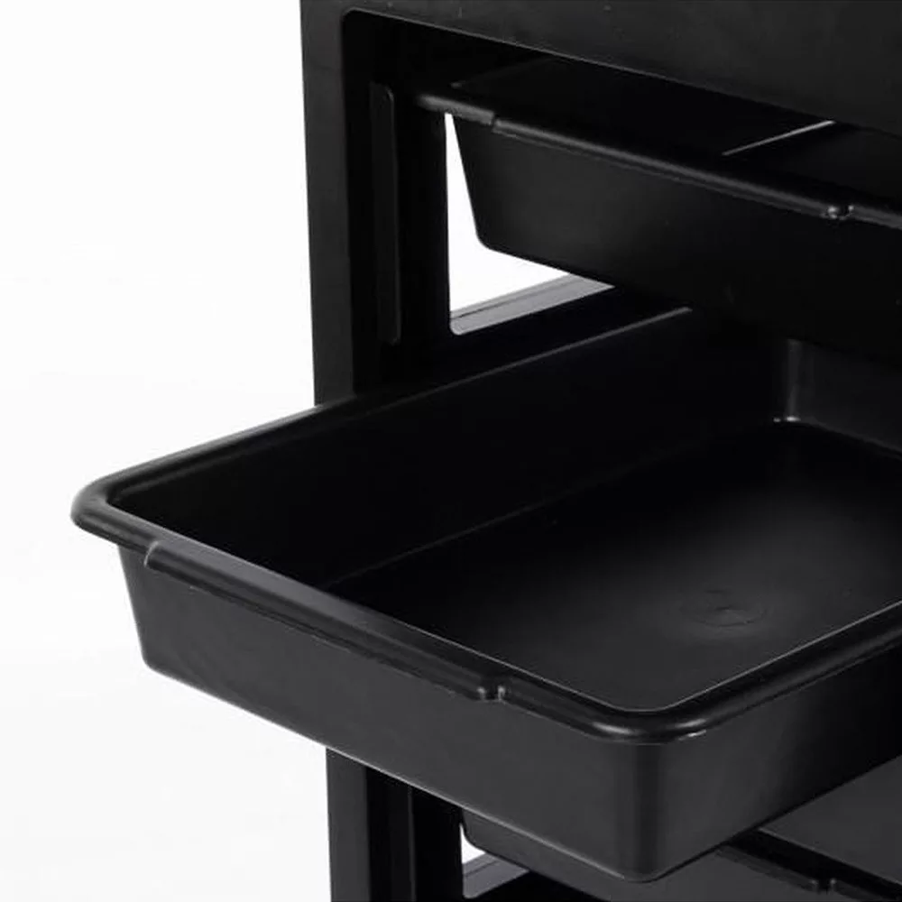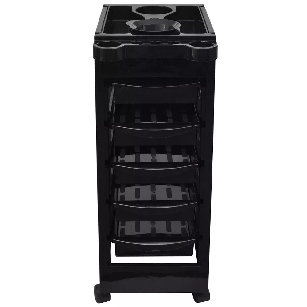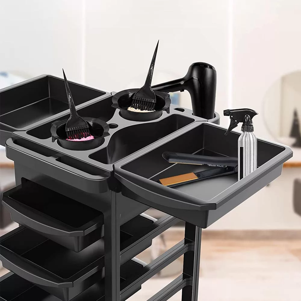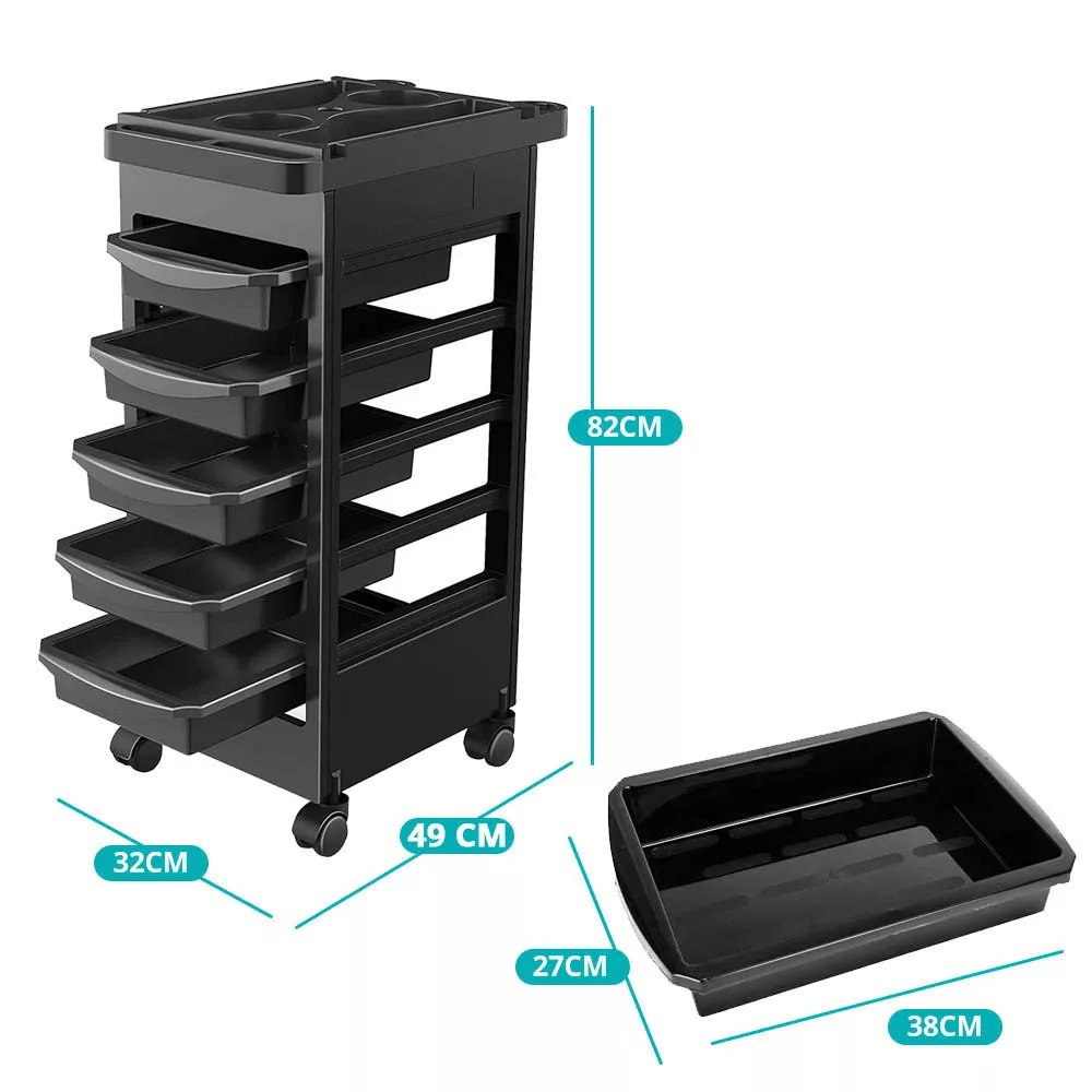 A fodrászkocsi 5 kihúzható tálcája lehetővé teszi az eszközök és kellékek rendszerezett tárolását. A tálcák mérete (38x27 cm) elegendő helyet biztosít hajvágó ollók, fésűk, hajfestékek és egyéb eszközök számára, így mindig minden kéznél lesz.
