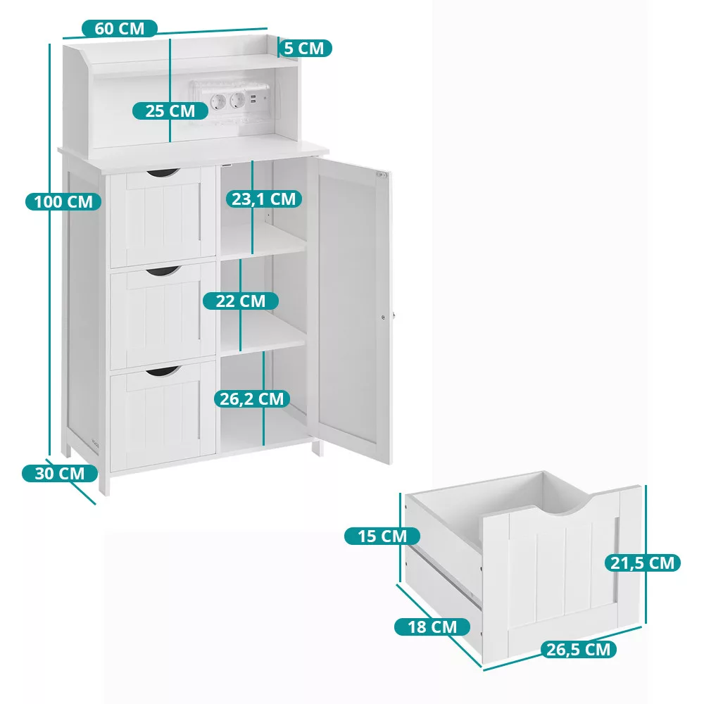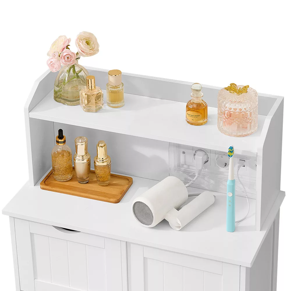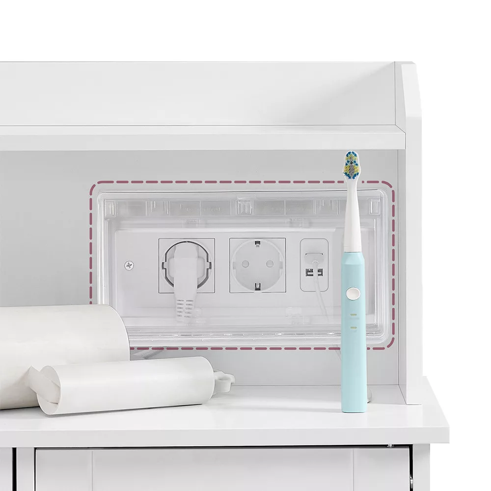 Ez a modern fürdőszobai szekrény nemcsak praktikus tárolóhelyet biztosít, hanem beépített töltőállomásával a mindennapokat is kényelmesebbé teszi. A felső polcon elhelyezheted telefonodat vagy dekorációkat, miközben a konnektorok és USB portok segítségével egyszerűen töltheted eszközeidet.