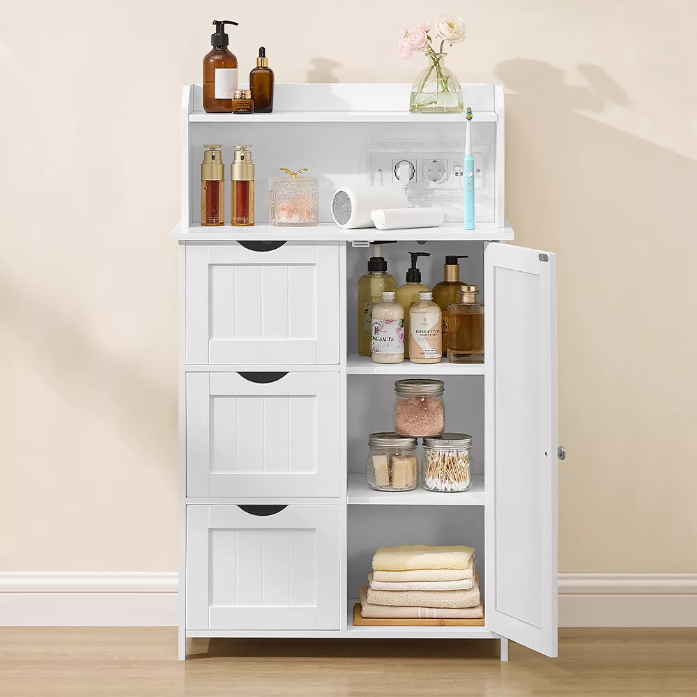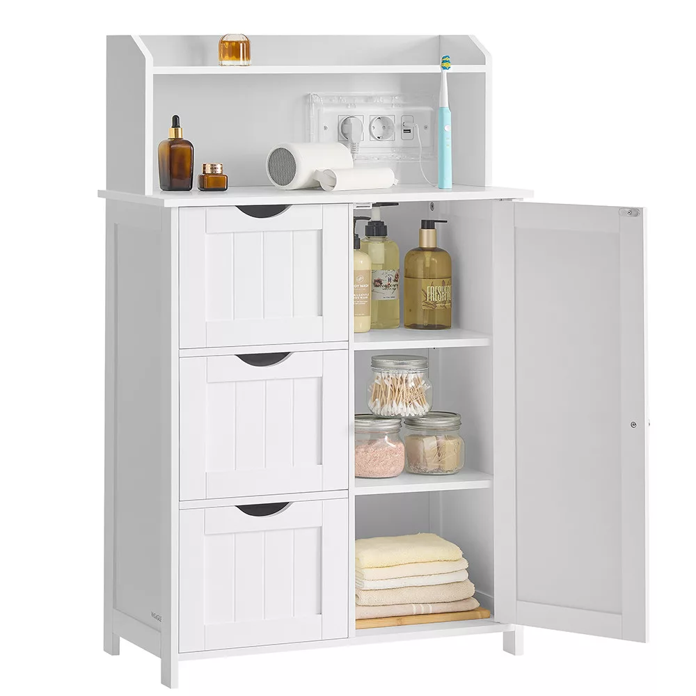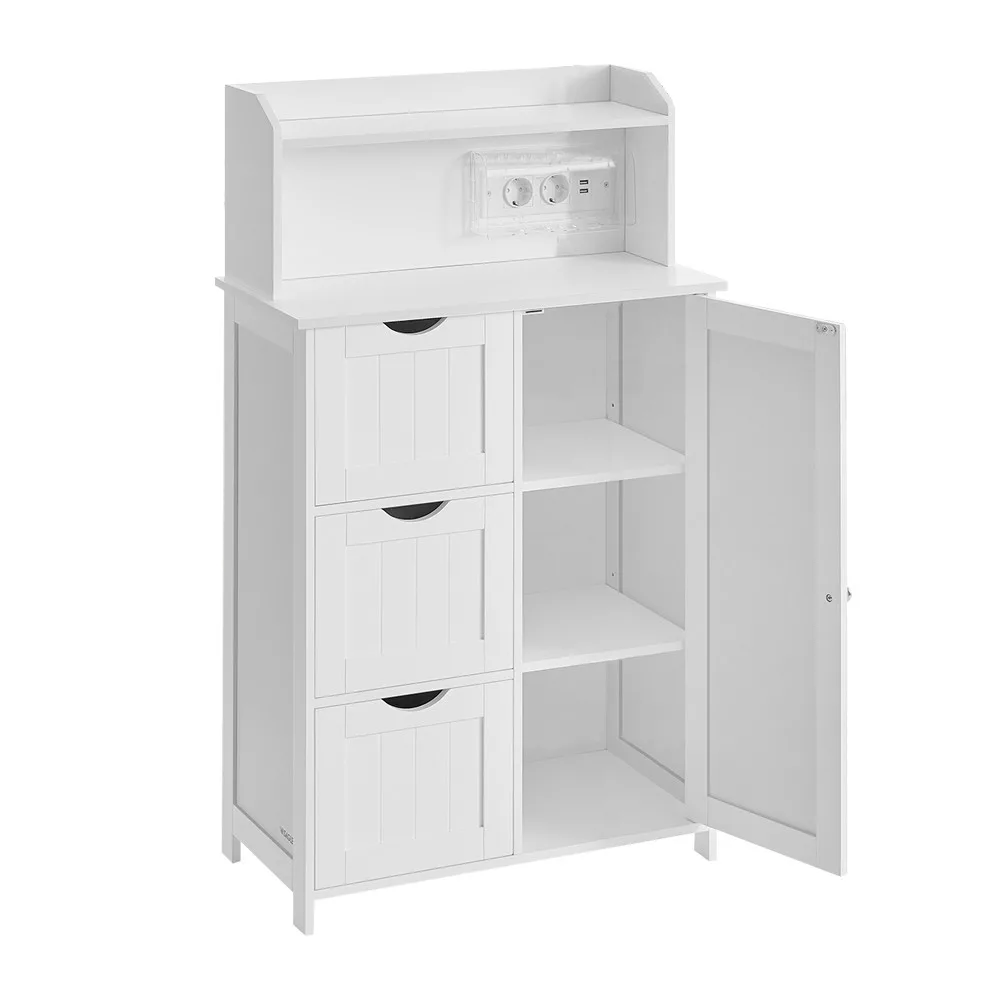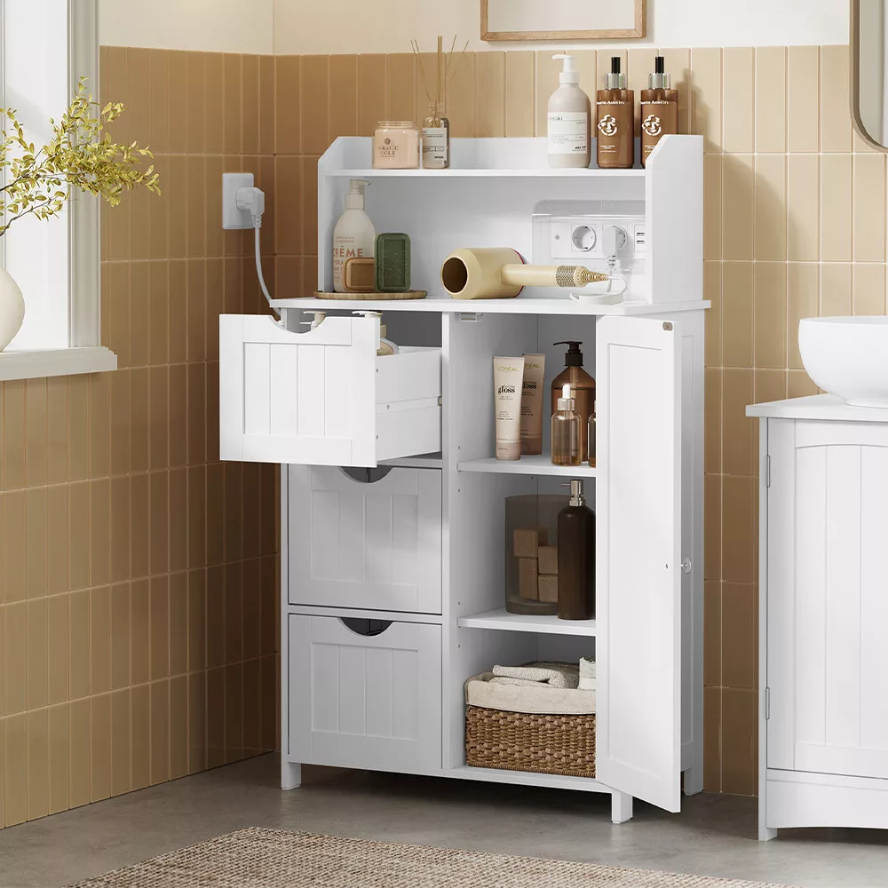 Ez a modern fürdőszobai szekrény nemcsak praktikus tárolóhelyet biztosít, hanem beépített töltőállomásával a mindennapokat is kényelmesebbé teszi. A felső polcon elhelyezheted telefonodat vagy dekorációkat, miközben a konnektorok és USB portok segítségével egyszerűen töltheted eszközeidet.