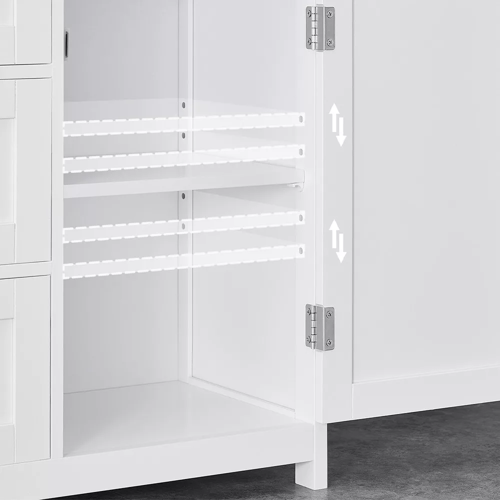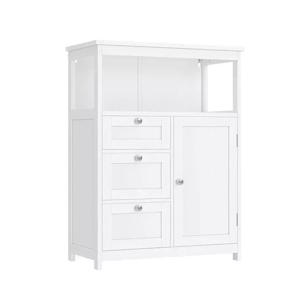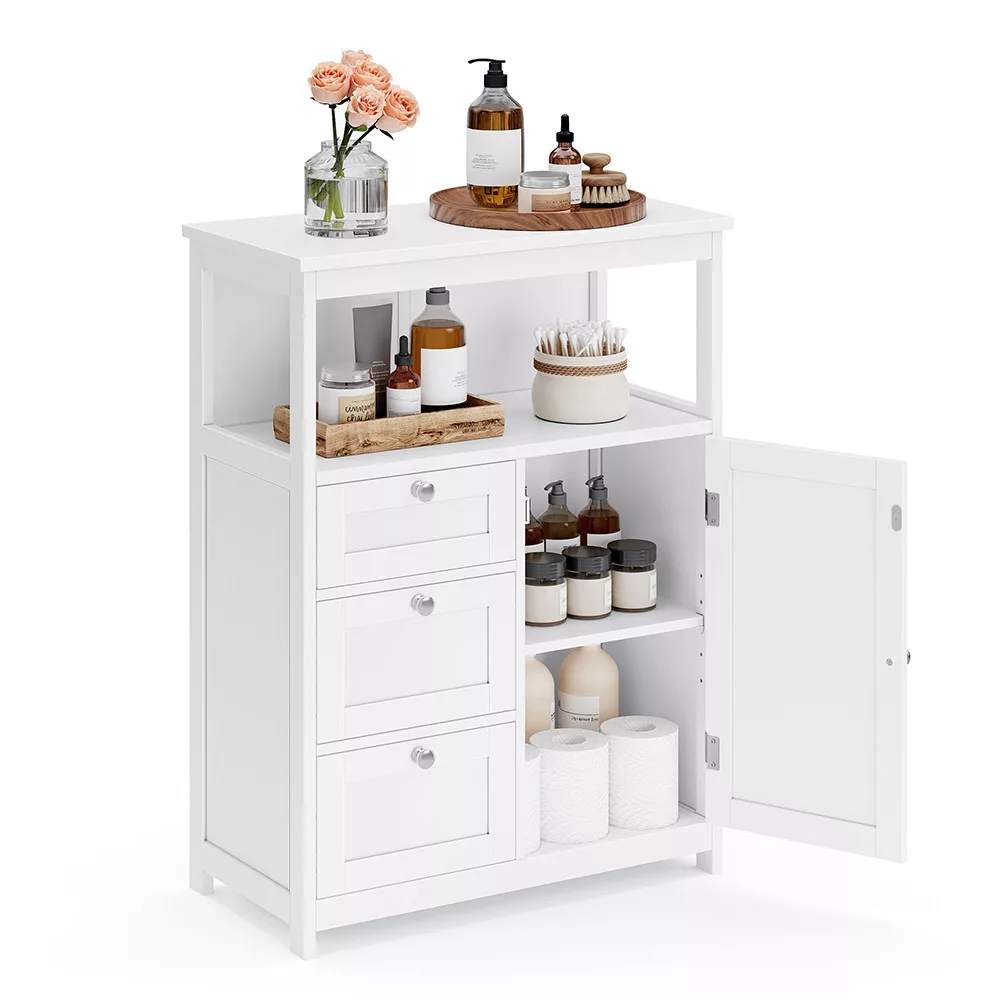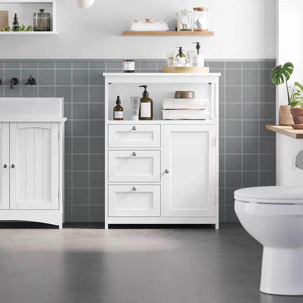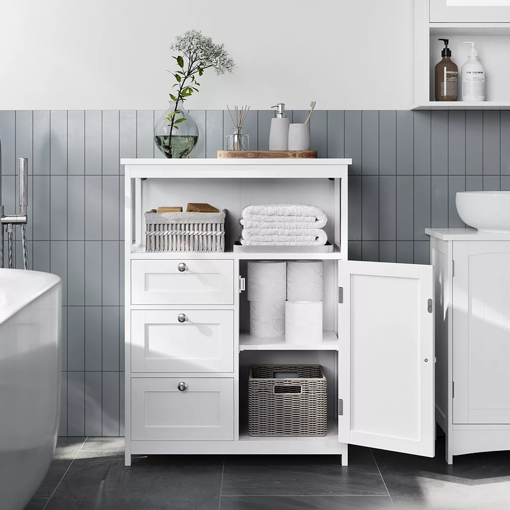 Ez a szabadon álló fürdőszobai szekrény segít, hogy minden fontos kelléked átláthatóan és könnyen elérhetően legyen elhelyezve. A nyitott polcokon a gyakran használt tárgyak, míg a zárt szekrényrészben a kevésbé szem előtt tartandó eszközök kapnak helyet.