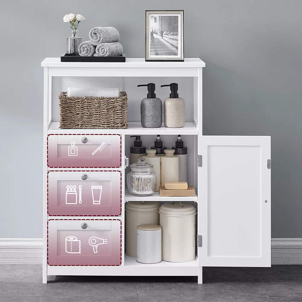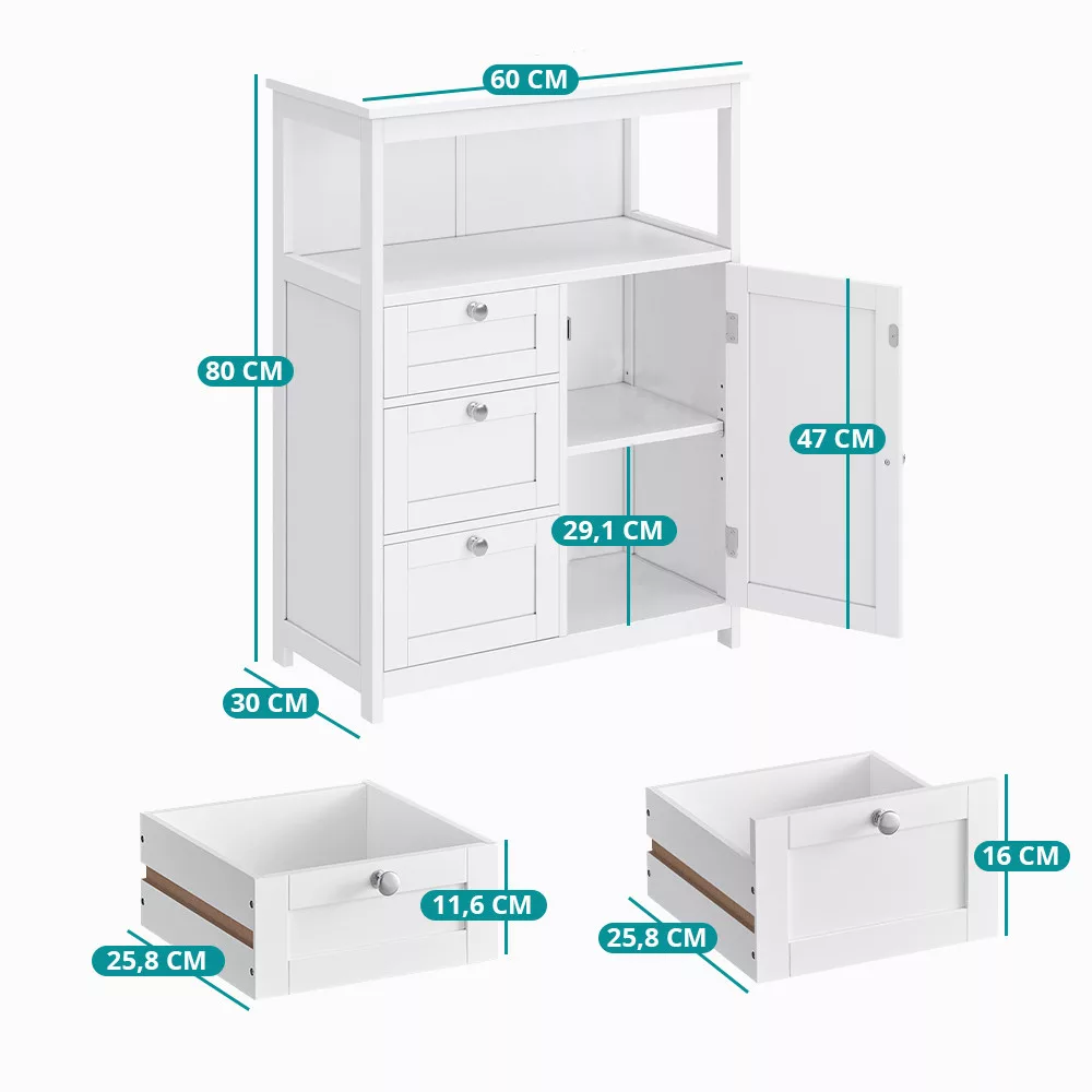 A három különálló fiók ideális kozmetikumok, kiegészítők vagy kisebb tárgyak rendszerezésére. A fiókok ütközőkkel ellátottak, így biztonságosan használhatók, míg az állítható polc lehetővé teszi, hogy a tárolóteret saját igényeidhez igazítsd.