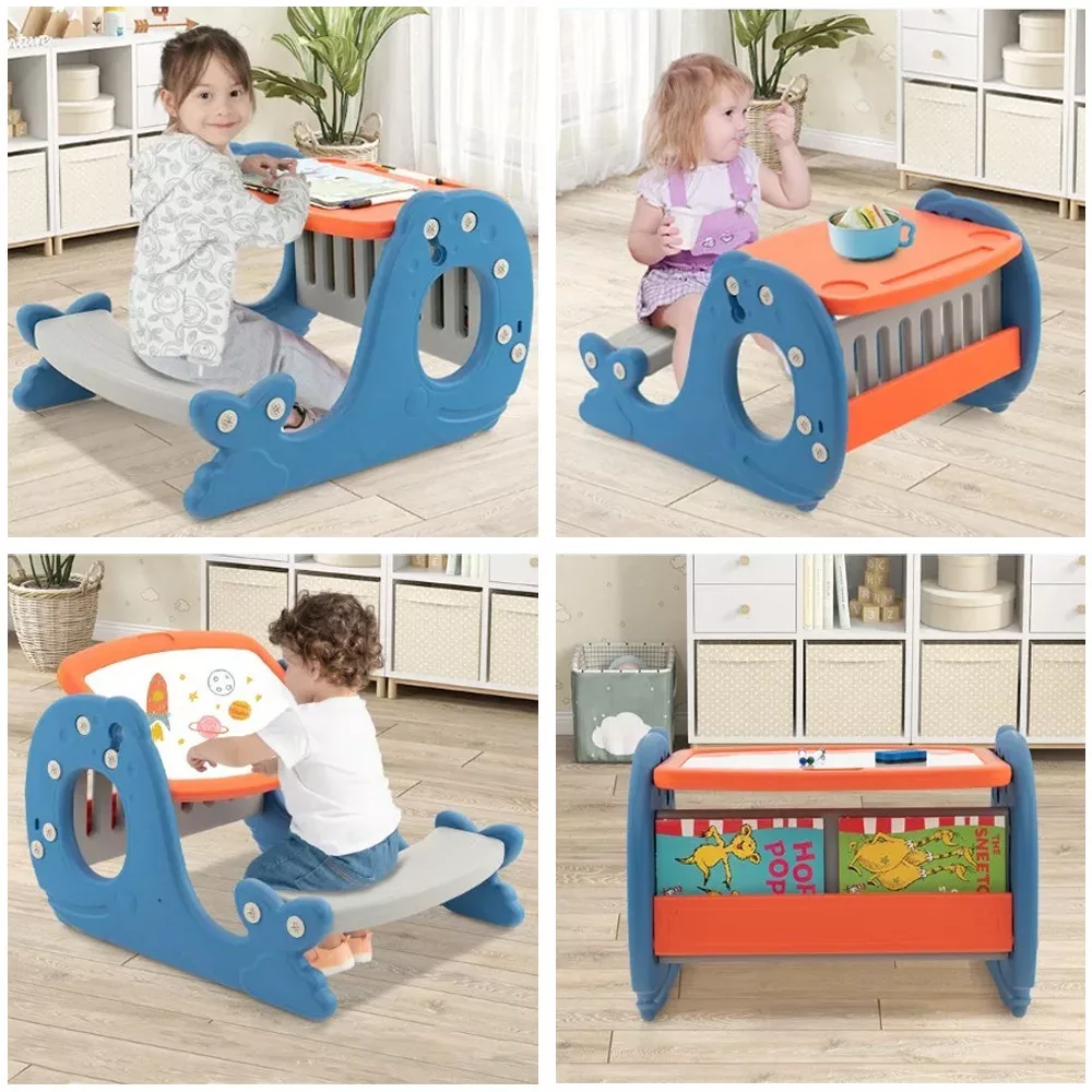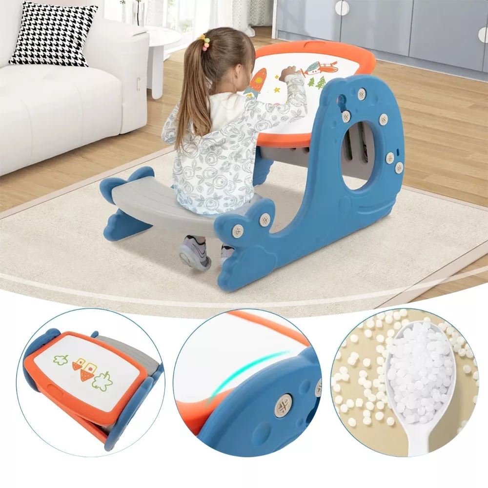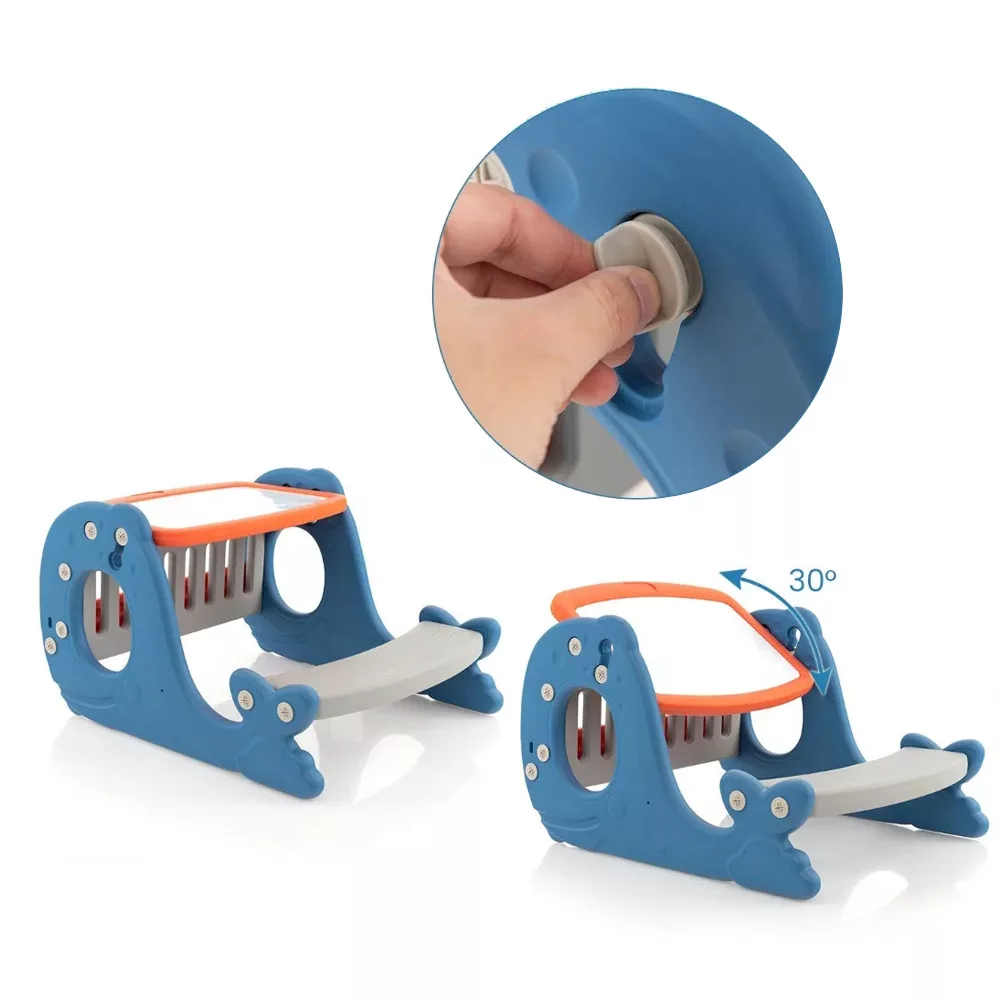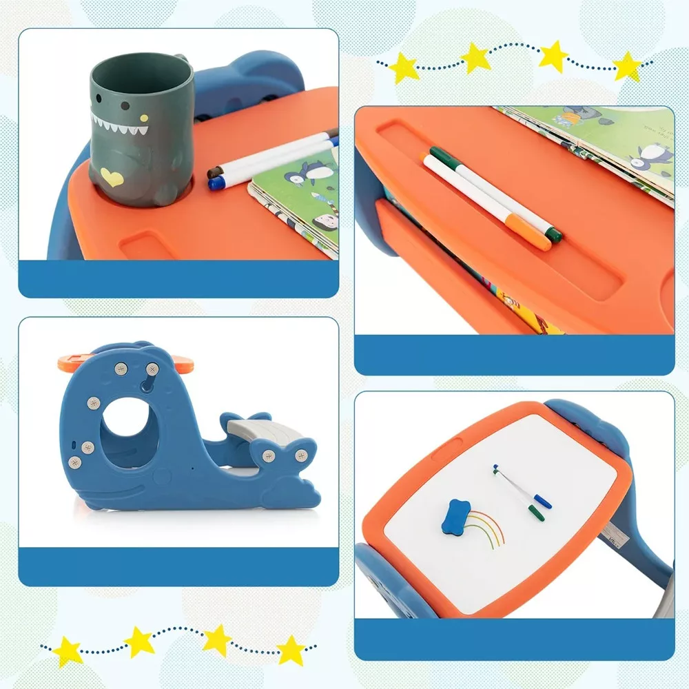 A lap egyik oldala sima asztalfelület, a másik fele fehértábla, így nem kell külön rajztábla a firkáláshoz. Ha rajzolnál, a táblás oldal dőlésszöge állítható, ezért a gyerek könnyebben látja, mit csinál, és kényelmesebben tud alkotni.