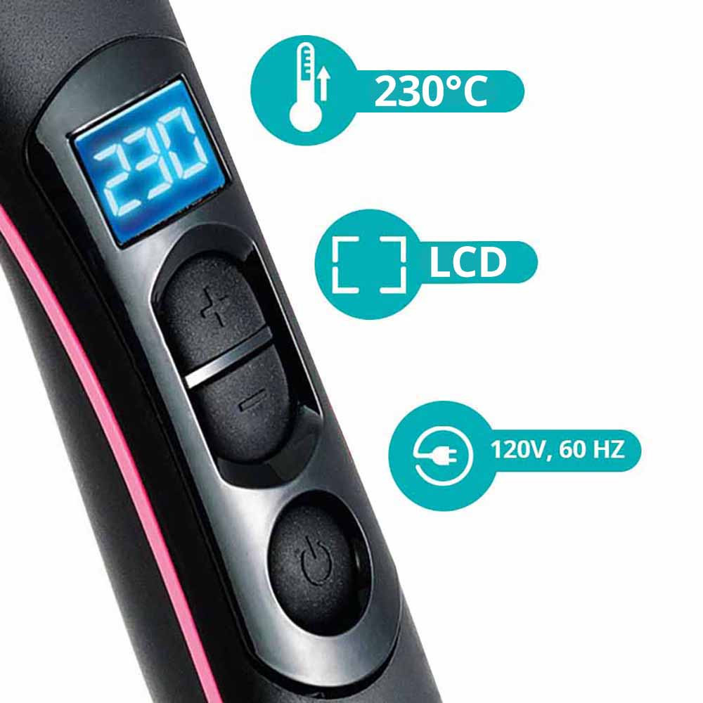 A fésű + és – gombokkal könnyen állítható hőmérsékletet kínál, akár 230 °C-ig. Az aktuális beállítást az LCD kijelzőn követheted, amely segít a pontos használatban és megakadályozza a haj túlhevülését.