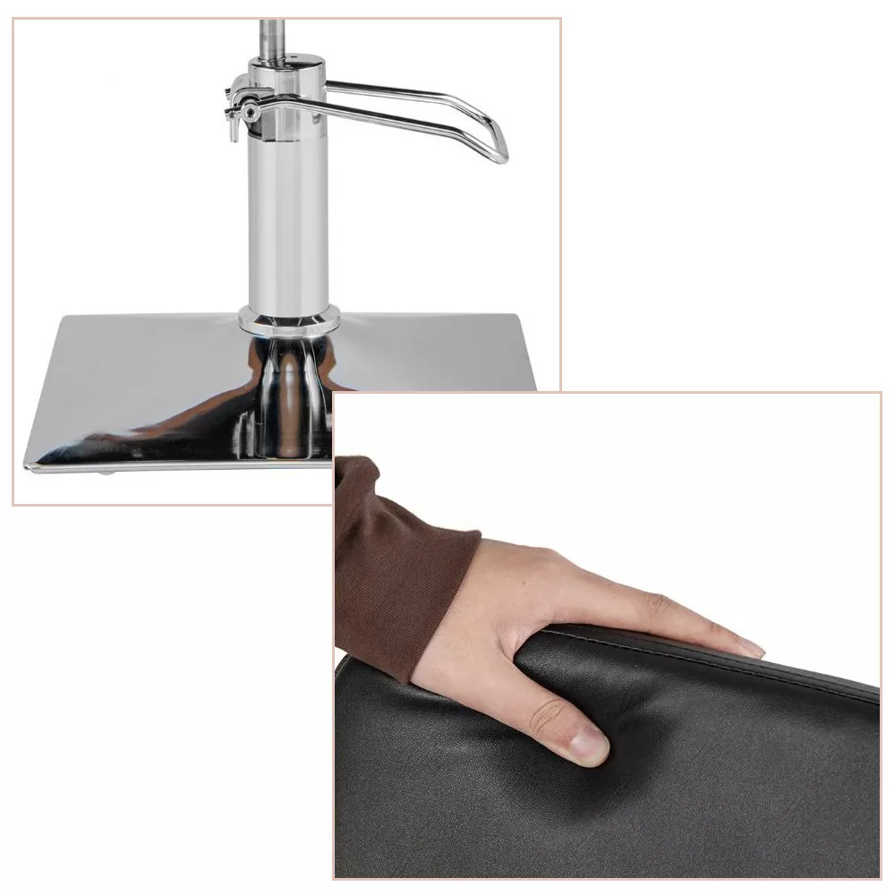 A hidraulikus mechanikának köszönhetően a szék magassága könnyedén állítható, így a különböző magasságú szakemberek is kényelmesen dolgozhatnak. A 360 fokban forgatható ülőrész fixálható is, hogy a vendég pozíciója mindig stabil maradjon a munka során. A vízálló és kopásálló PVC műbőr borítás könnyen tisztítható, ami különösen fontos a mindennapi szalonhasználat során. Az anyag nem szívja magába a folyadékokat és ellenáll a vegyszereknek is, így a szék hosszú távon megőrzi újszerű állapotát.