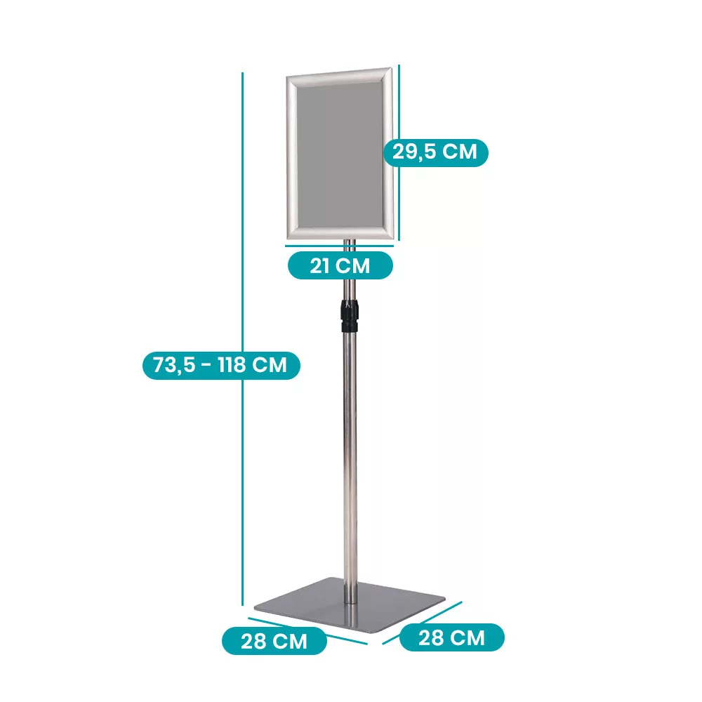 Ez az információs állvány ideális választás üzletekbe, kiállításokra és rendezvényekre, ahol fontos a letisztult és rendezett megjelenés. Alumínium keretével és rozsdamentes acél tartószerkezetével stabil és elegáns megoldást kínál a hirdetések bemutatásához.