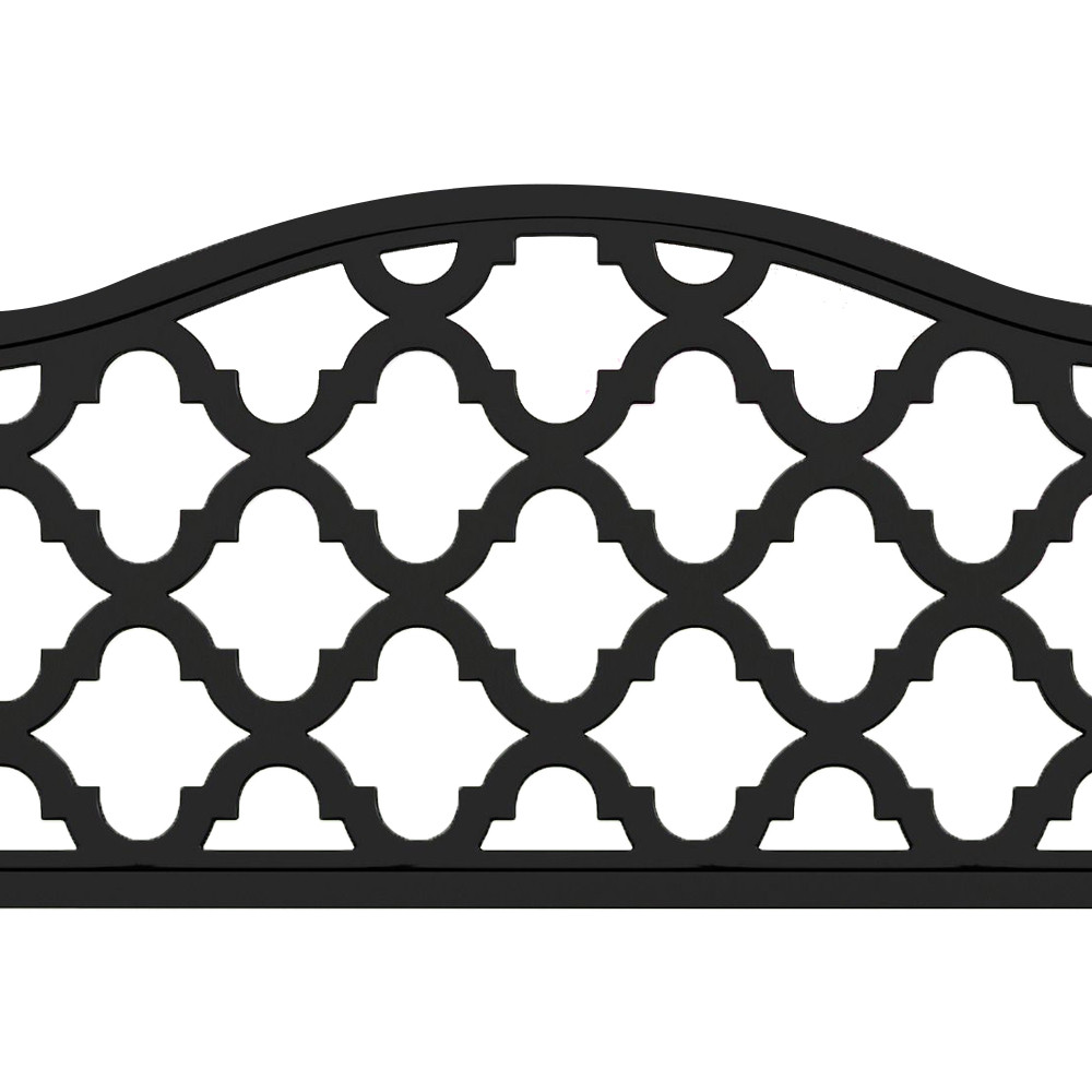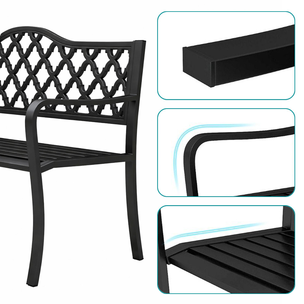 A háttámlán lévő mintázat egyszerűen szebbé teszi a padot, anélkül hogy hivalkodó lenne. A fekete szín könnyen illik a legtöbb kerti bútorhoz és korláthoz, így könnyű összehangolni a környezettel.