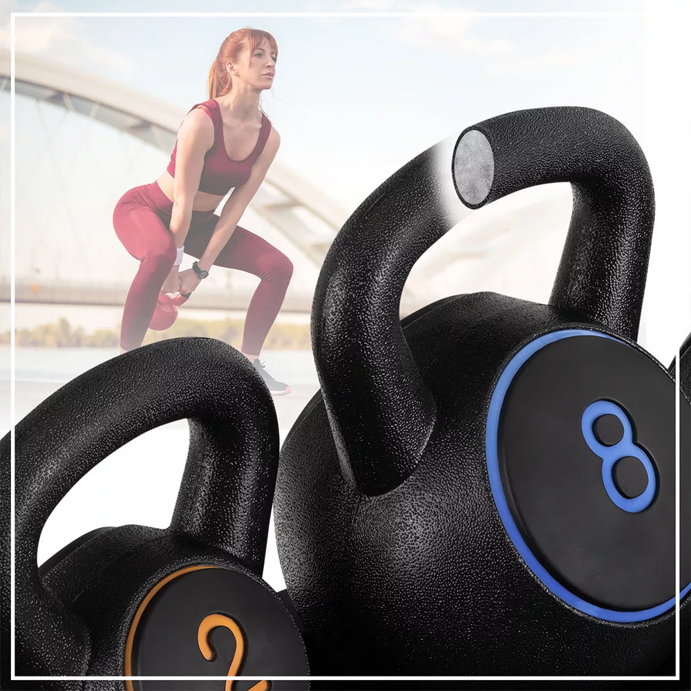 A 2 kg-os kettlebell ideális bemelegítéshez és technikatanuláshoz, a 4 kg-os változat kiváló erő-állóképességi edzésekhez, míg a 8 kg-os súly nagyobb izomerőt igénylő gyakorlatokhoz használható. A súlyok közötti váltás egyszerű és gyors.
