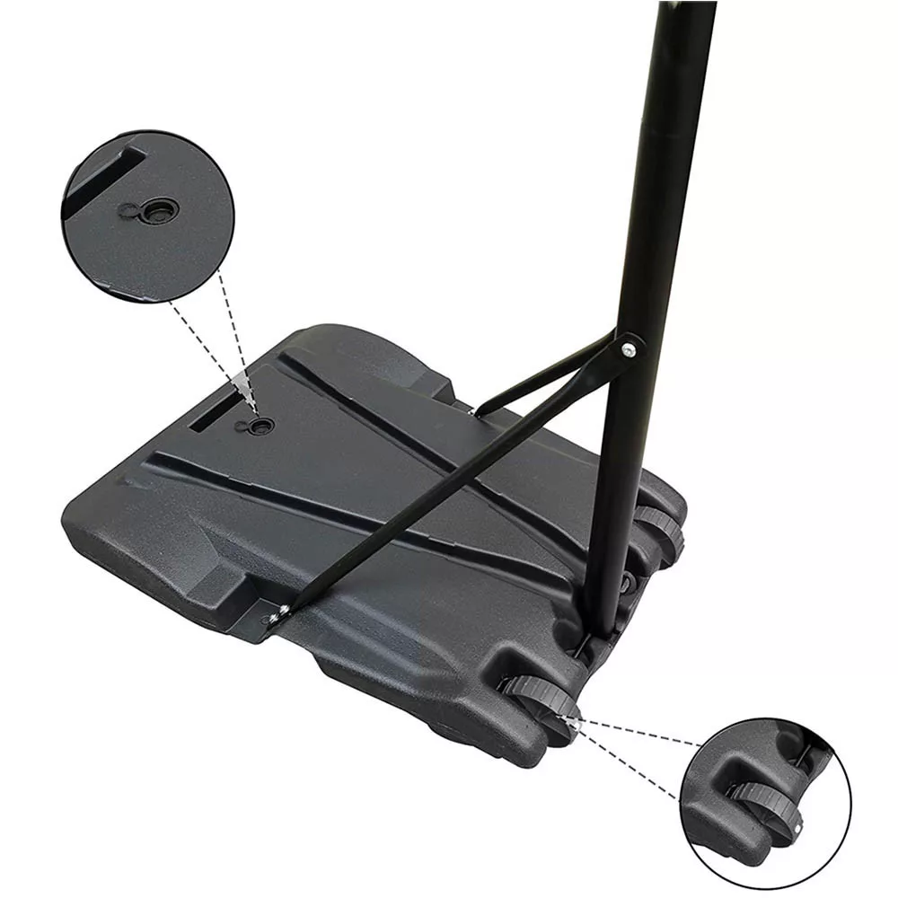 Az erős fém oszlop és a vízzel vagy homokkal feltölthető talp garantálja a stabilitást még intenzív játék közben is. A két kerékkel ellátott talp könnyedén mozgatható, így a palánk egyszerűen áthelyezhető a kert egyik részéből a másikba. A strapabíró műanyag palánk és nylon háló időjárásálló, így kültéri és beltéri használatra egyaránt alkalmas.