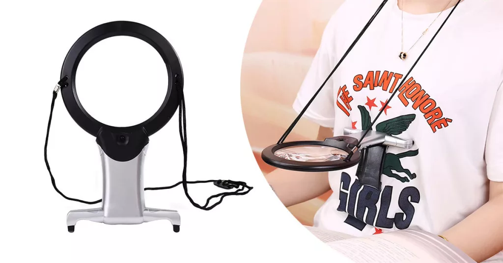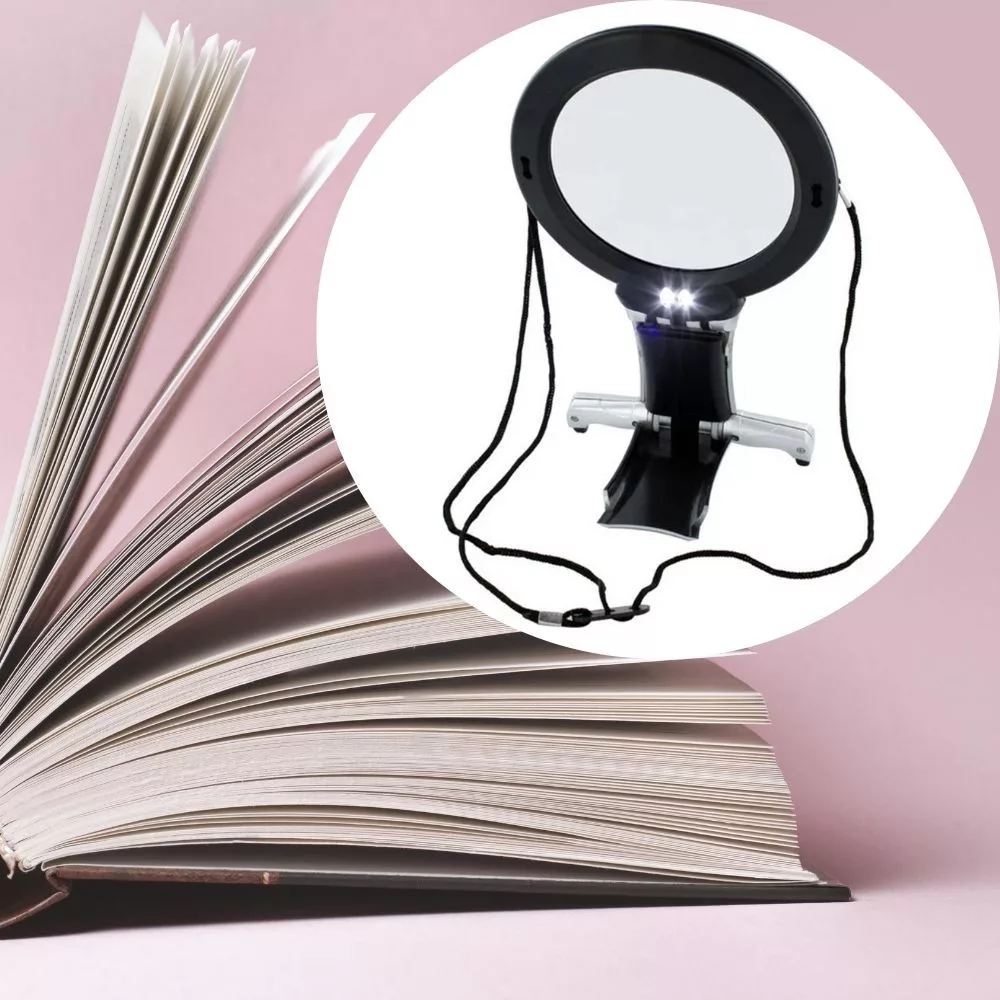A nyakbaakasztható kialakítás és a stabil, lehajtható állvány lehetővé teszi a kéz nélküli használatot, így ideális kézimunkához, hímzéshez, modellezéshez vagy hobbi célokra is. A súlyelosztás és a puha zsinór révén hosszabb használat során sem válik kényelmetlenné.