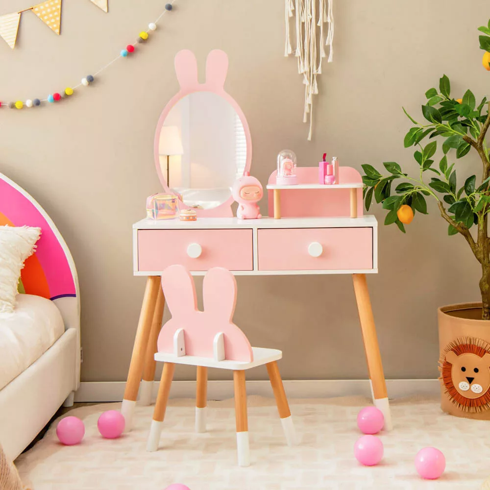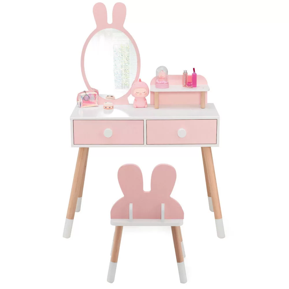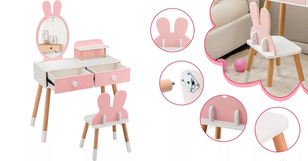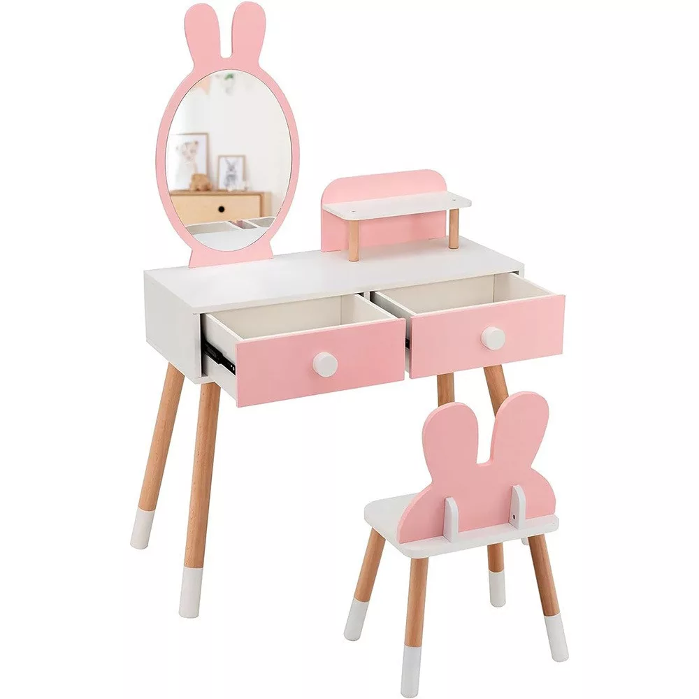 A nyuszis fésülködőasztal tökéletes dísze lesz bármely kislány szobájának. A nagy méretű tükör nyuszifüles dizájnjával elvarázsolja a gyerekeket, a hozzá tartozó kisszék pedig kényelmes helyet biztosít a játékhoz.