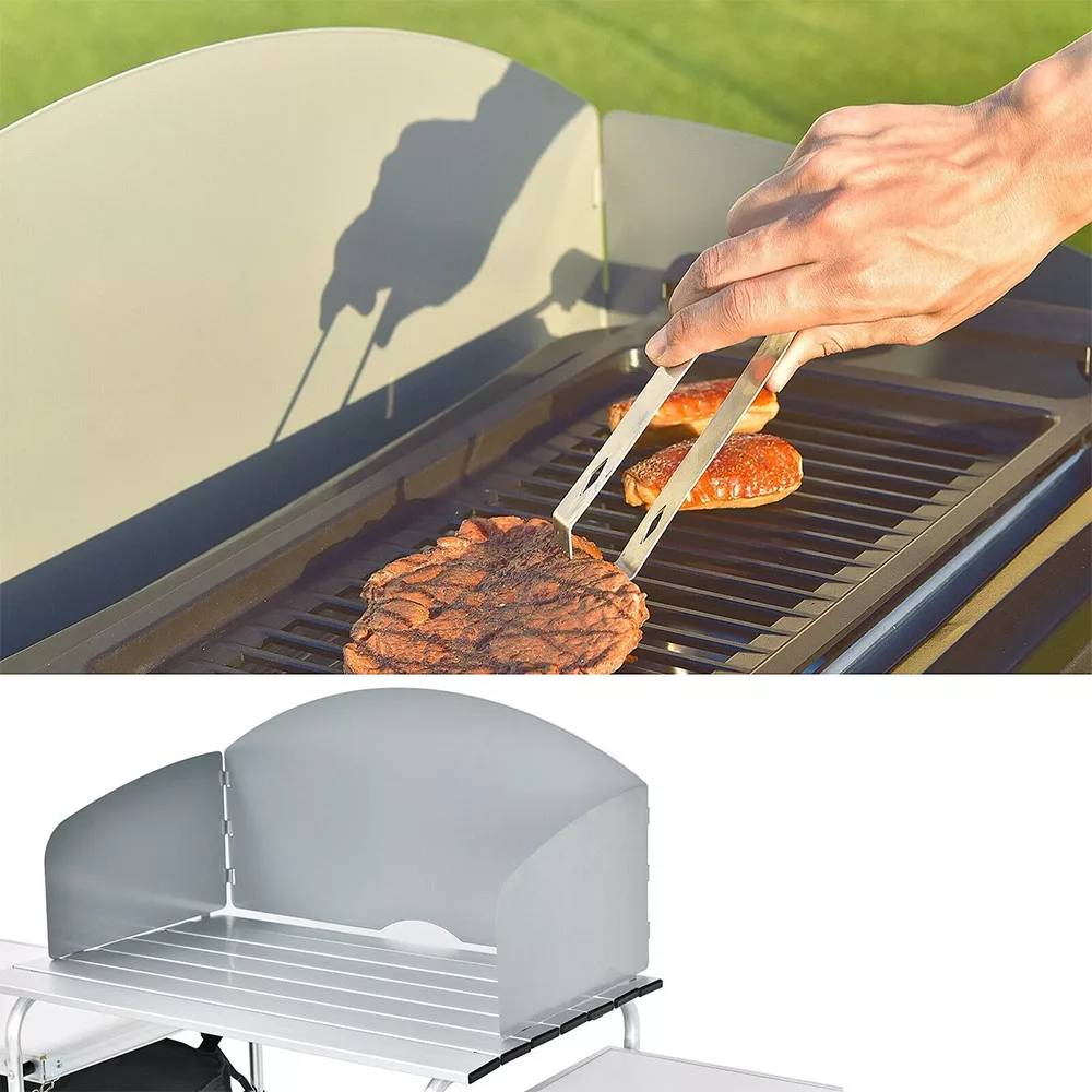 A visszafogott színvilág és a rendezett kialakítás jól mutat kempingben és a teraszon is. A szélfogó keret nemcsak praktikus, hanem egységes, „konyhapult” jellegű megjelenést ad, így nem szétszórt eszközök között kell dolgoznod.