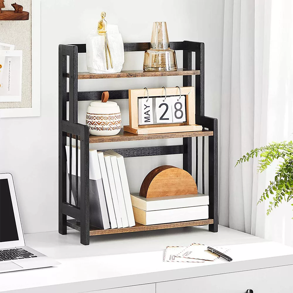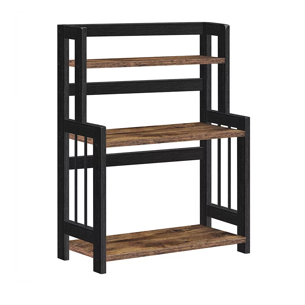 A rusztikus barna polcok és a fekete vázelemek harmonikus összhatást alkotnak, így a tároló nemcsak praktikus, hanem dekoratív eleme is lehet a konyhádnak, étkeződnek vagy akár az irodádnak.