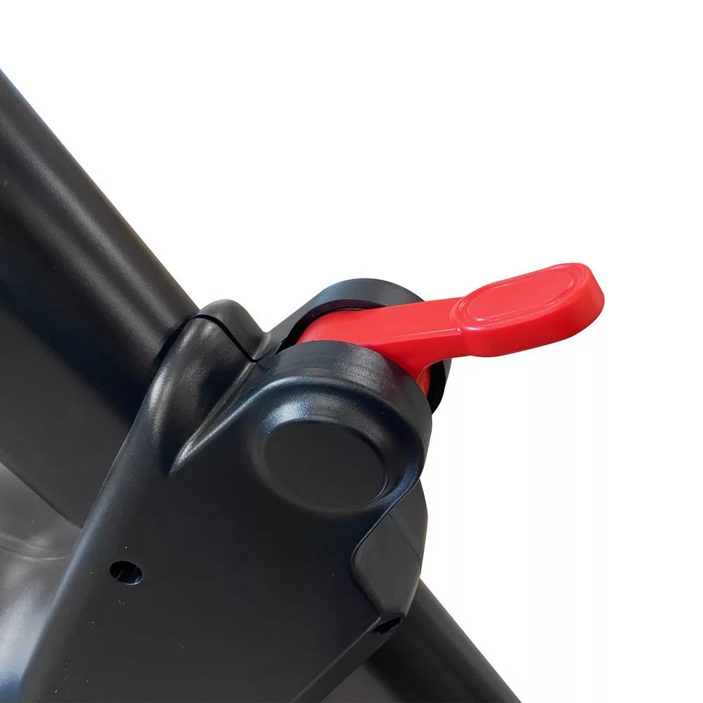 A spinning kerékpár robusztus váza kiváló stabilitást nyújt még nagy intenzitású edzések során is. Az első és hátsó stabilizátorok, valamint a csúszásgátló lábak garantálják, hogy a bringa a helyén maradjon, bármilyen keményen is hajtasz. A piros ellenállásgombbal könnyedén szabályozhatod az edzés intenzitását. Ez a mechanikus rendszer valósághű, sima pedálozási élményt nyújt.