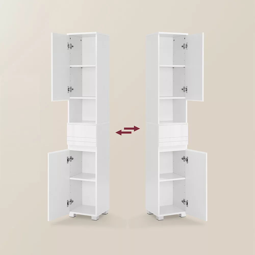 A szekrényen belüli polcok állíthatók, az ajtók nyitási iránya pedig szabadon választható, így a tárolás könnyedén igazítható a különböző méretű tárgyakhoz.