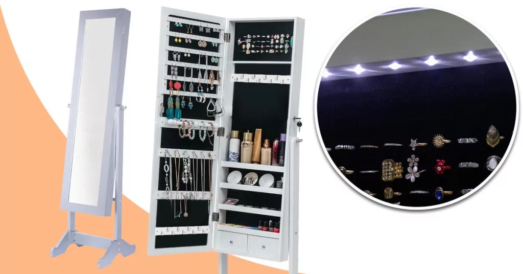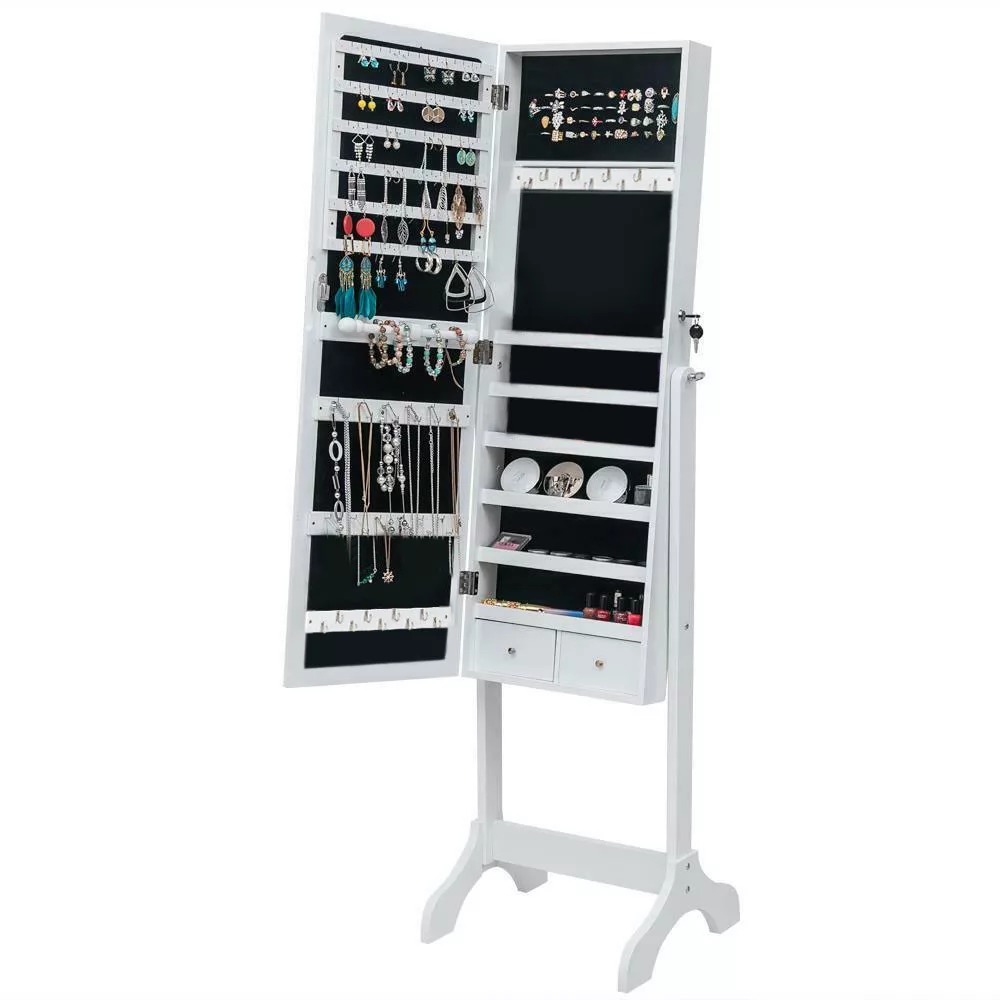 A szekrény belsejében 3 × 9 db akasztó biztosítja a nyakláncok rendezettségét, emellett külön rekeszek állnak rendelkezésre gyűrűk, karkötők és fülbevalók számára. A puha plüss belső borítás óvja az ékszereket a karcolódástól és egy helyre rendszerezi a legfontosabb kiegészítőket.