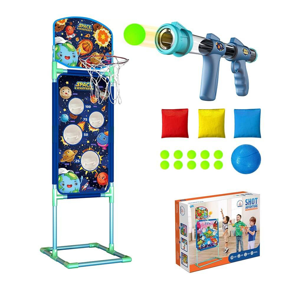 A gyerekek különböző módon célozhatnak és dobhatnak, így mindig új kihívásokat élhetnek át. A homokzsákokkal a lyukakon kell átjuttatni a célokat, a kosárlabda gyűrű pedig a precíz dobásokat jutalmazza. A mellékelt játékfegyver még izgalmasabbá teszi a versengést, hiszen a habszivacs golyók célba juttatása extra ügyességet igényel.