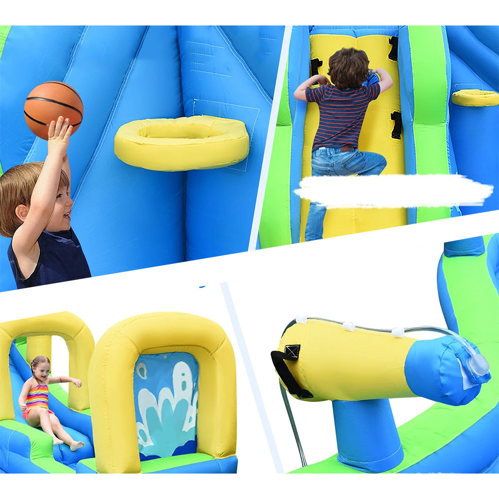 Ez a sokoldalú felfújható vízipark tökéletes választás, ha gyermeked számára izgalmas, aktív szabadtéri élményt keresel. A vízicsúszda, a tágas pancsoló, a mászófal és a két vízágyú órákon át tartó szórakozást nyújtanak. A beépített kosárpalánk és a színes, játékos kialakítás különösen vonzóvá teszi a kisebbek számára.